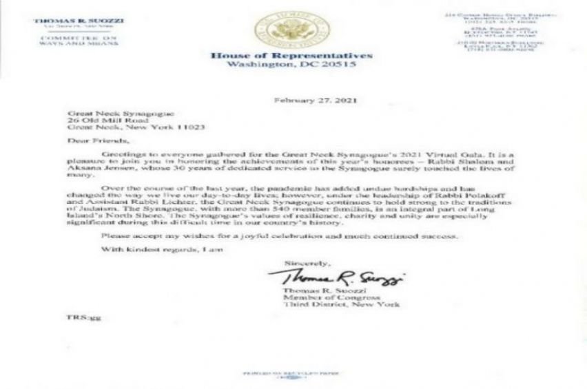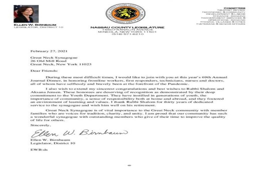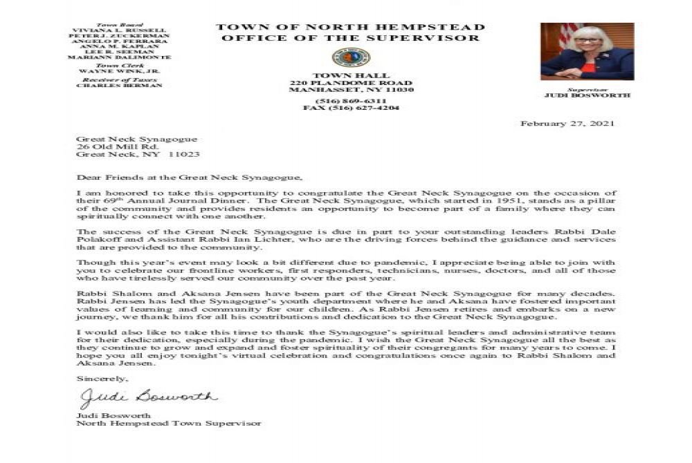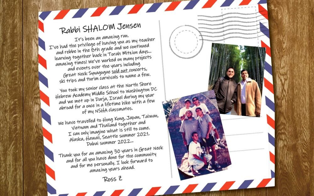 This year the Great Neck Synagogue is privileged to honor Rabbi and Aksana Jensen at the first ever GNS Virtual Gala. For the last 30 years, Rabbi Jensen has created innovative youth programing including but not limited to Succah Sleepovers, the Purim Shpiel, Ski Trips, Kiddush Cup Club, Torah Madness, Chanukah at MSG and many others. Rabbi Jensen has been to all our GNS family's smachot and at all these events he has led the dancing. One event that I would like to mention took place in January of 94'. A NSHA student was putting on Tefillin for the first time in the GNS main sanctuary. As most proud parents do, they made sure to have their camera set up to record the special day. When Rabbi Jensen saw the camera, he figured that it wasn't recording, and this was an opportunity to put a smile on the students' faces. He went up to the lens and began making crazy faces. When the lens started focusing, he realized that the camera was recording. He succeeded, everyone was laughing at the situation. Fast forward many years and that video belongs to the current President of the GNS. We will cherish all the amazing memories we have made together, and although we have to say goodbye to our wonderful friends, we are so happy for the Rabbi and Aksana on their journey to Israel. Rivka and I wish you much success and happiness. Jordan Wolf aa Great Neck Synagogue