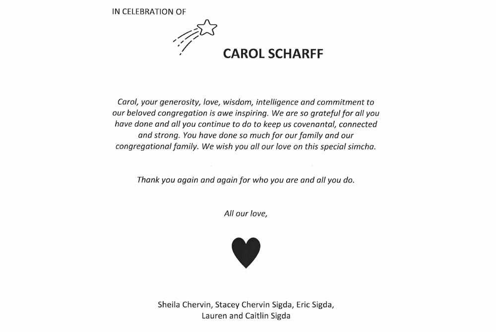 Carol Scharff-- The heart & soul of Larchmont Temple. Marnie Foster-Marks & Adrienne Weiss-Harrison & Andrew Harrison Congratulations, Carol! A one-of-a-kind lady. The Altersohn Family Frank, Amy, Andrew, Allison, Mira and Jaclyn Congratulations, Carol. So well deserved! Susan Band Horwitz White
