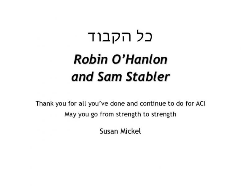 Sarah O'Hare: Your hard work this year and your love of Judaism are inspirational. We love you! Mom & Dad Robin and Sam are wonderful friends and supporters of ACI. Mazel Tov on this well-deserved honor! -The Piechota Family Kudos to Elysa and Rafi! Honoring Jacob and Max Love, Meema and Saba Mollyann and Peter Blumenthal Quarter Page