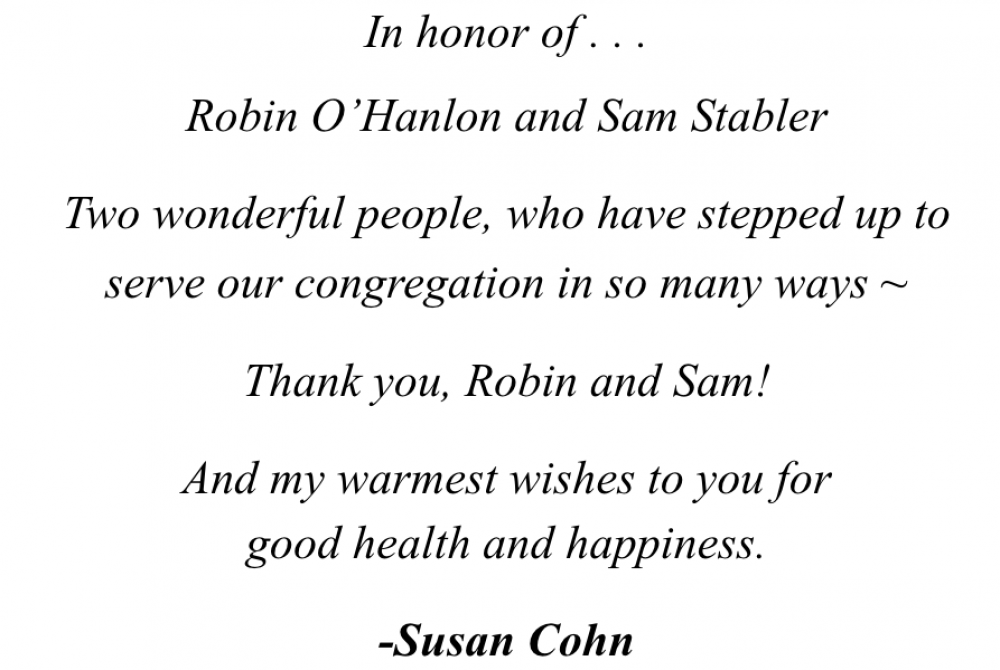 In honor of our parents Norm & Sara Jane Sherman. May they know good health. In honor of Anna, who enters Columbia University this fall for graduate school. In honor of Nava, who will study at Pardes in Jerusalem and then SUNY Binghamton. Mazal tov to Robin and Sam on this honor.