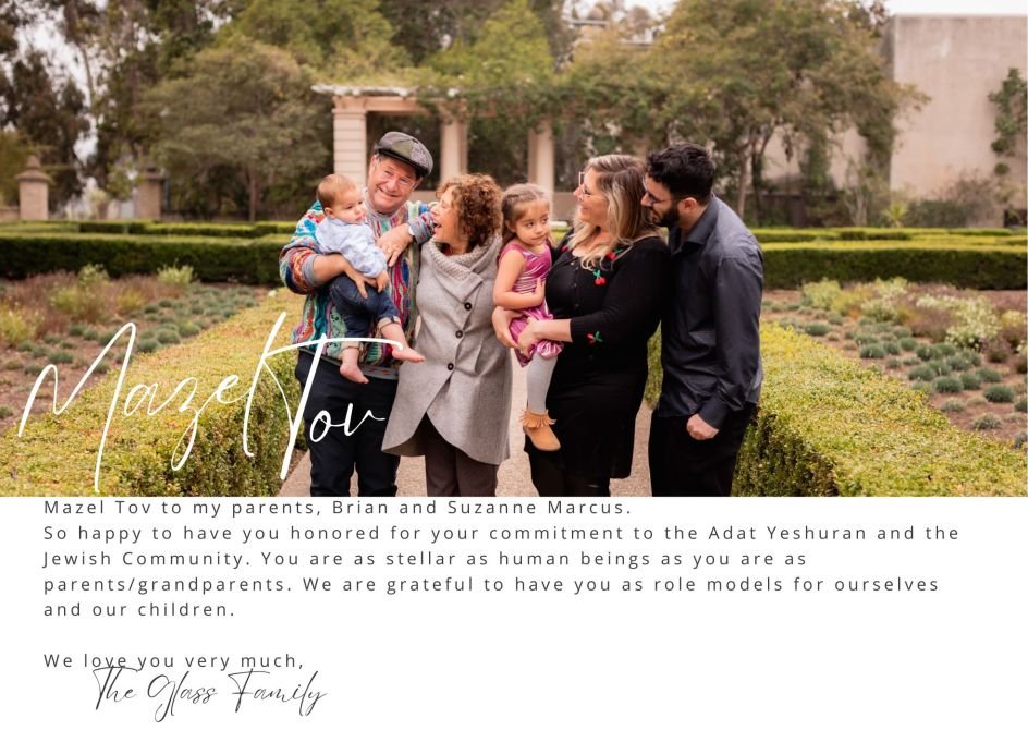 Mazal Tov to Brian and Suzanne Marcus. We are blessed by your unwavering support and commitment to our Adat community. With Gratitude, Marc and Felicia Gipsman