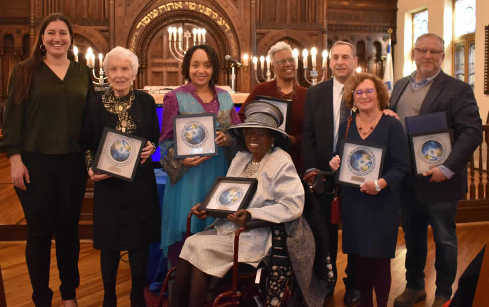 (From L to R) Gala Chair Emily Manz, Honoree Paula Gottesman, Honoree Eyesha Marable, Honoree Councilwoman Mildred Crump, Honoree Dr. Nell Painter, Ahavas Sholom President Eric Freedman, Honoree Dr. Nancy Cantor, Honoree Charles Rosen)
