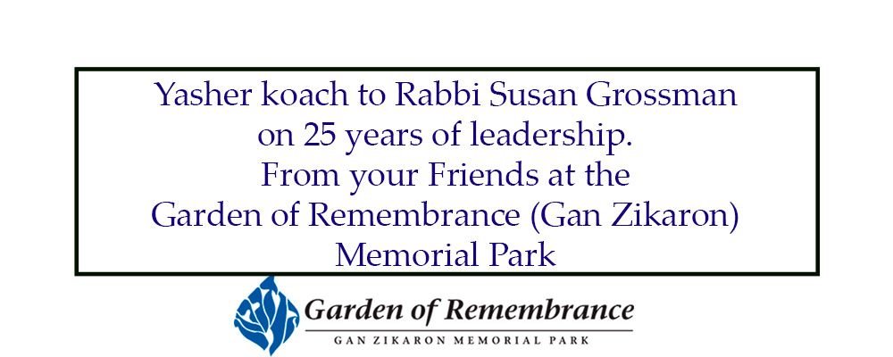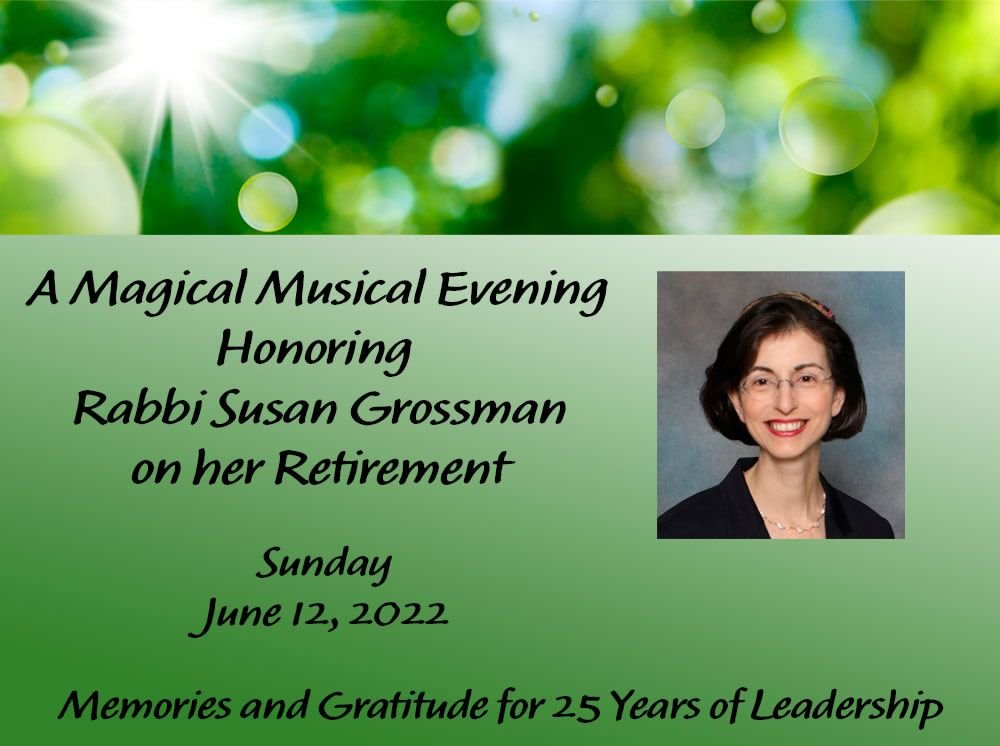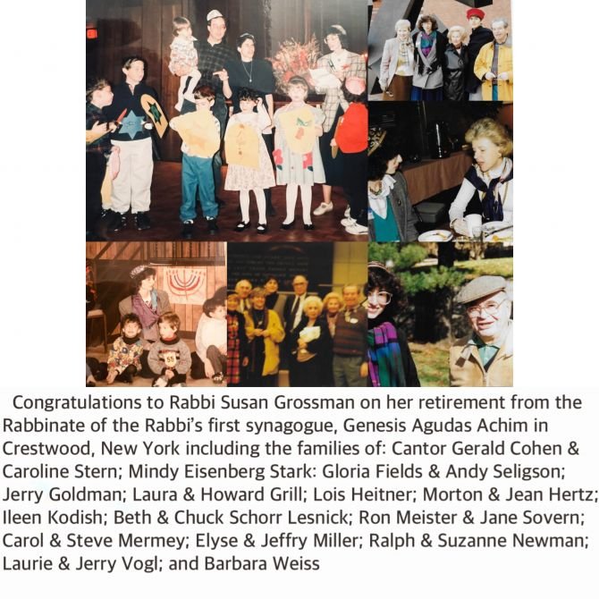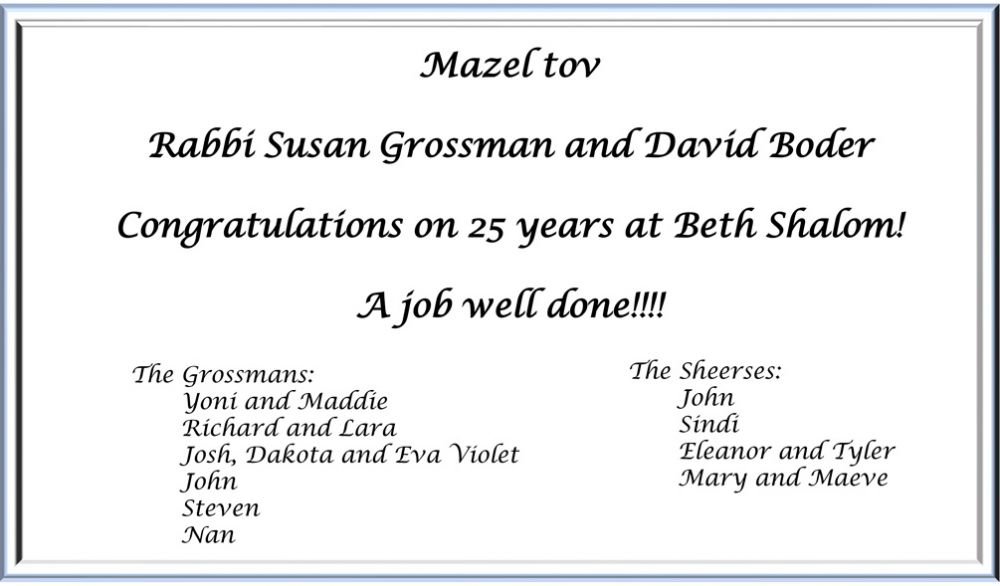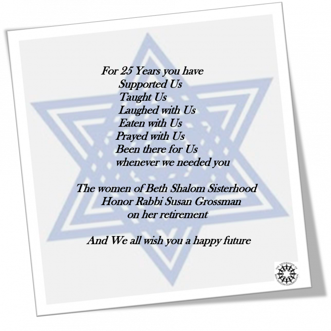 Thank You Rabbi Susan Grossman for your spiritual leadership over the last 25 years. Jessica Bienstock; Arnie, Hannah, and Miriam Sheetz
