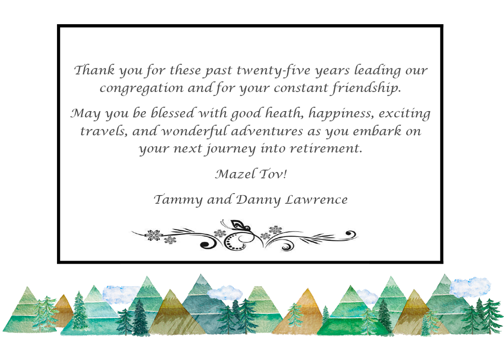 We enjoyed having you as our Rabbi. We wish you a long and happy retirement. Irene and Paul Sacher