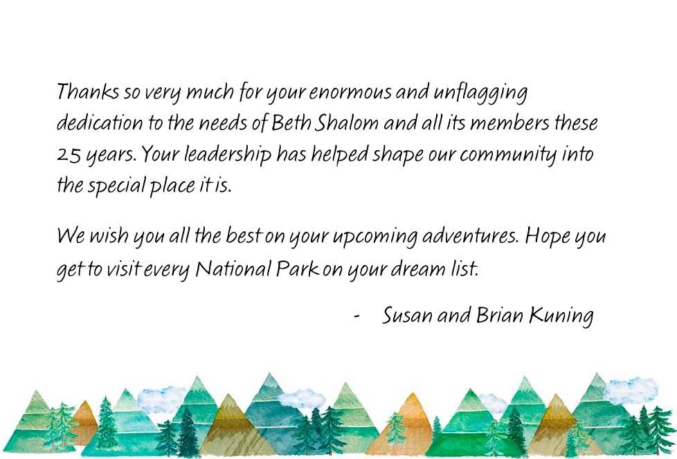 Thank you for your dedication to Beth Shalom. May your retirement bring you everything you hope for. Belinda Laufer