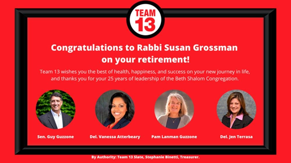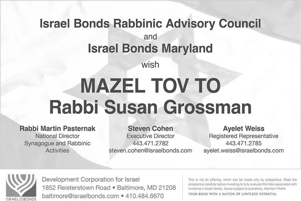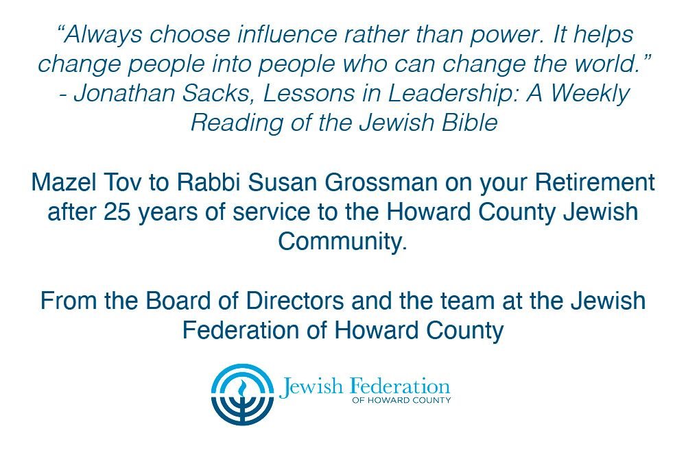 Councilmember Deb Jung salutes Rabbi Susan Grossman - one of Howard County's most effective faith community leaders. Mazel Tov! Councilmember Deb Jung By Authority: Committee to Re-Elect Deb Jung, Judith A Center, Treasurer Mazel Tov to Rabbi Susan Grossman on your retirement. The Caplan Family