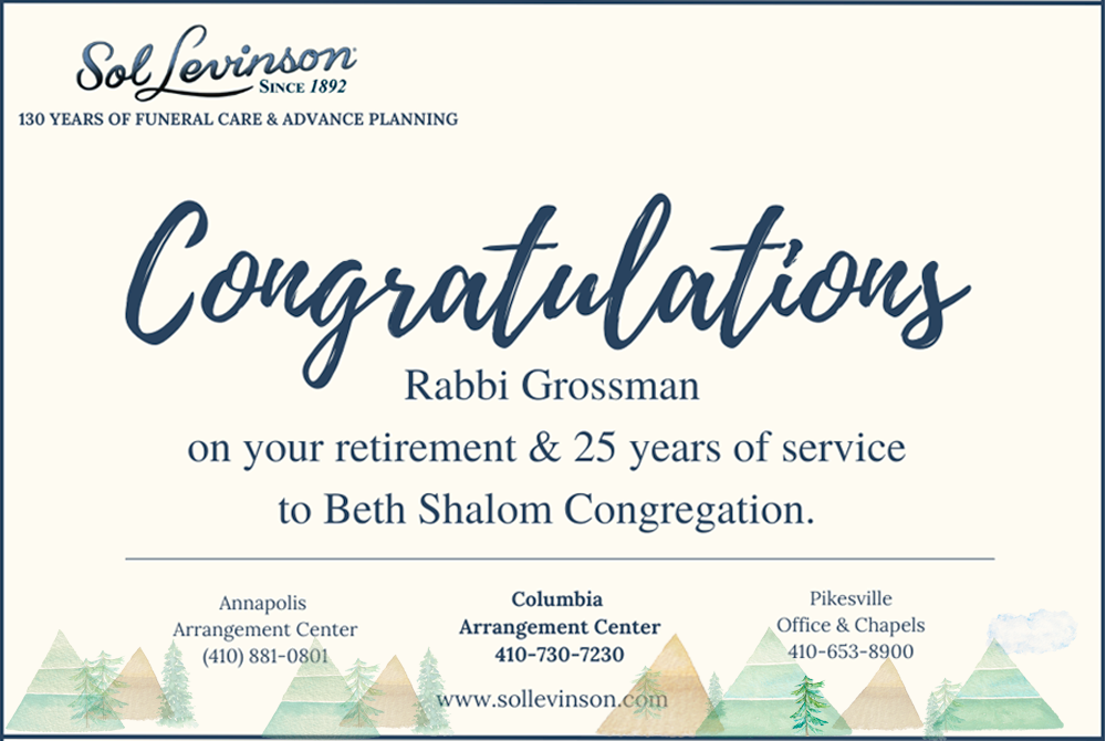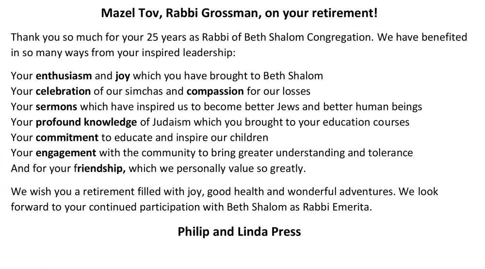 Thank you, Rabbi Grossman, for your leadership, scholarship, and dedication to Beth Shalom.