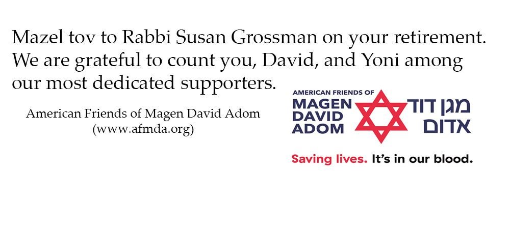 Mazal Tov to Rabbi Susan Grossman, an honored rabbi and trusted colleague. Happy retirement! Sharon and Phil Pohl