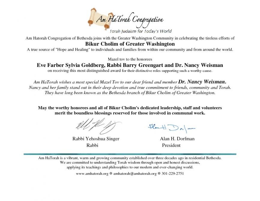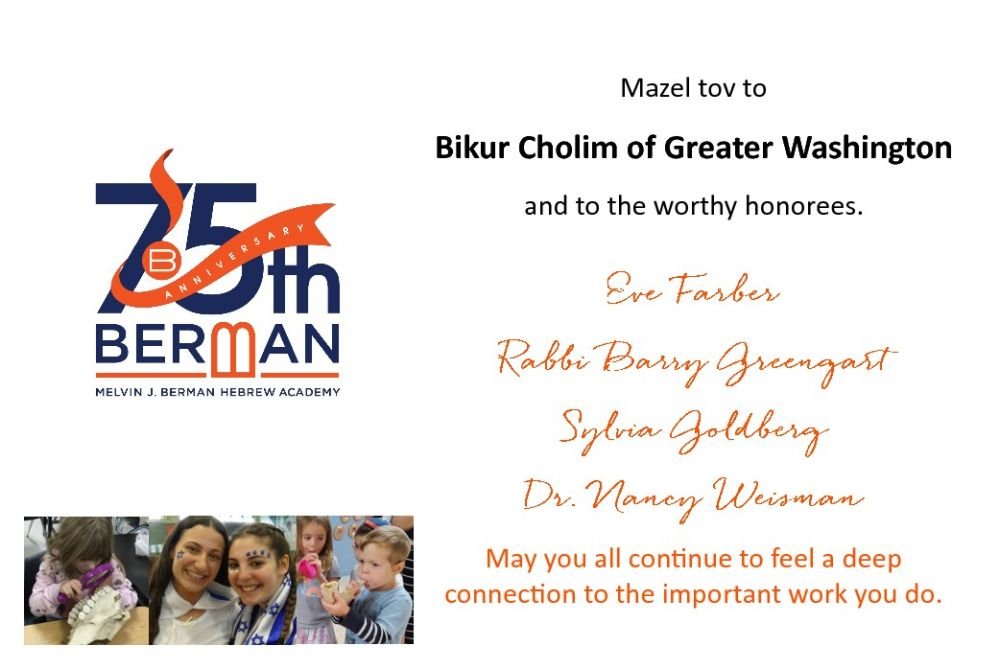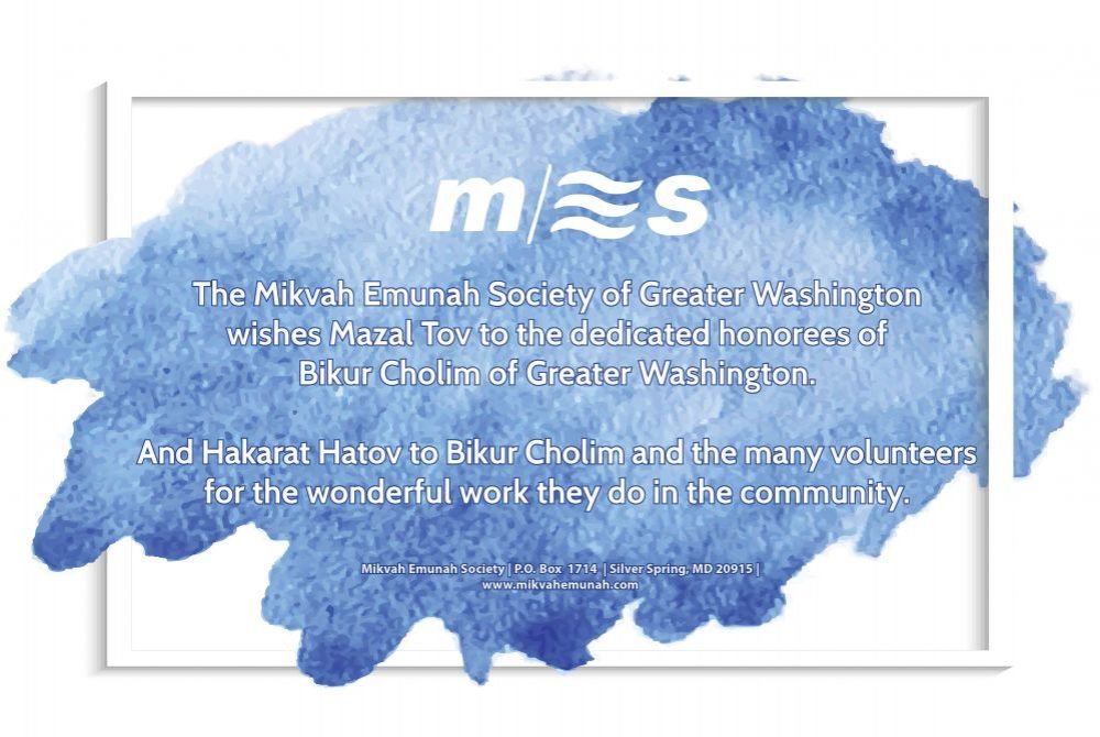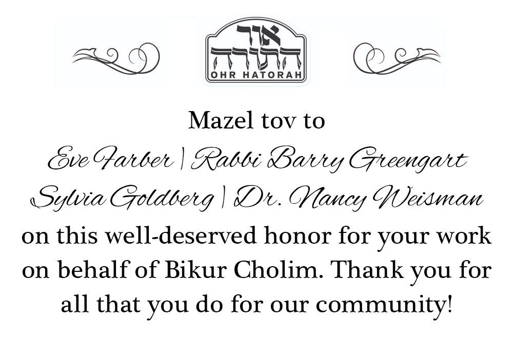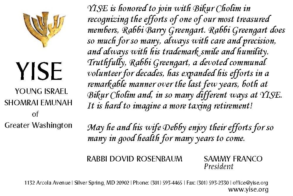 Rabbi Barry Greengart for his selfless dedication to Bikur Cholim and its life-affirming efforts in our community -and- In gratitude to Bikur Cholim of Greater Washington for the sensitive and caring manner in which it provides essential services to individuals and families in need Shmuel and Mindy Tolchinsky