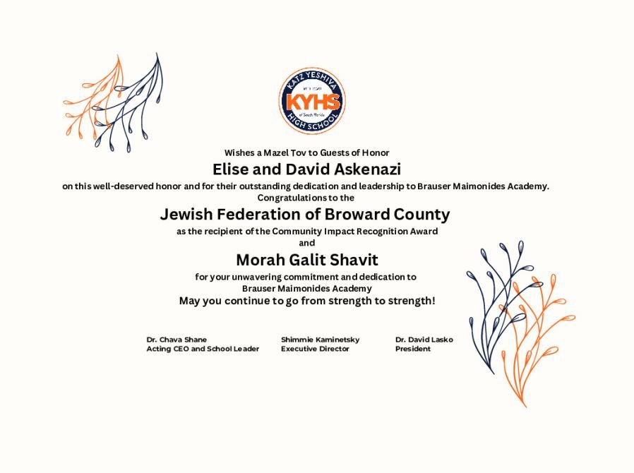 Mazel tov to Elise and David, and Morah Galit on the much-deserved honors! And thank you to Broward Federation! Gabi and Jillian Gliksberg
