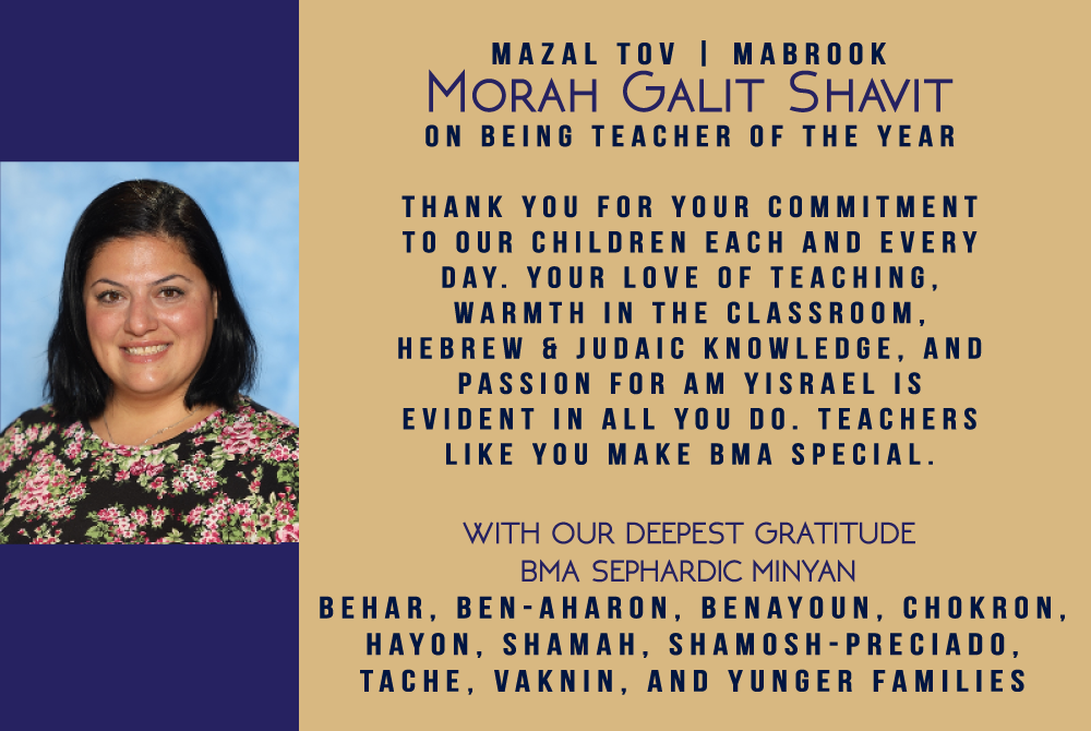 better place. Your leadership, generosity and devotion are endless. You are an inspiration to all! It has been a true pleasure "working" with you! May we continue to swap our travel adventures! Did I communicate that ok?! Morah Galit - Thank you for being an amazing teacher to our children! Your dedication, love and warmth for all your students knows no bounds. A special thank you to the Jewish Federation of Broward County for being such generous partners in educating the children of BMA and Broward County!