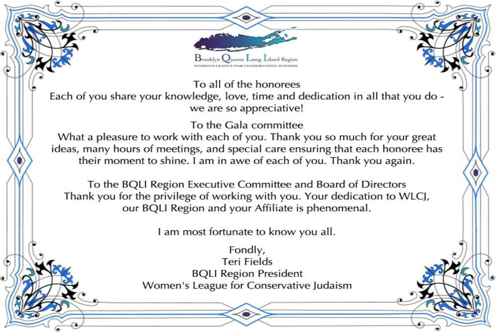 Raise our glasses proudly in celebration of Annie Lelonek! Love always, Spence, Rachel and Ezra Gould Congratulations Rachel! You are well deserving of this honor for the years of work & dedication you have given! Myra Greenseid Jericho Jewish Center Sisterhood congratulates DIANE CHARET. Mazel Tov on her commitment, hard work & dedication. Cindy Tannenbaum, JJC Sisterhood President Mazal tov to the 2025 Honorees You are all dedicated volunteers. You make us proud as members of the BQLI Region Barbara Kaplan Friend