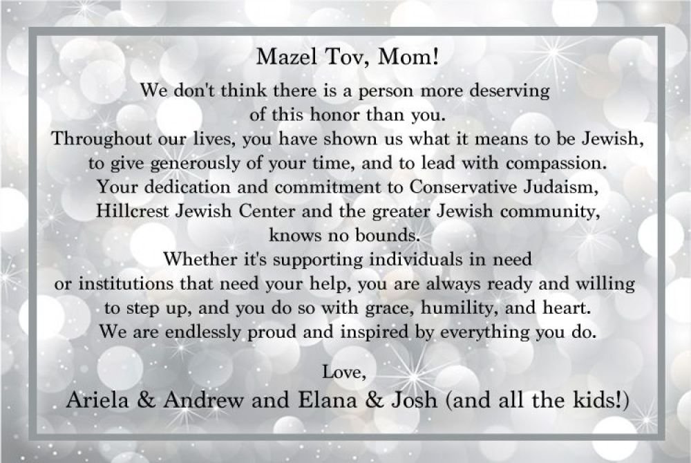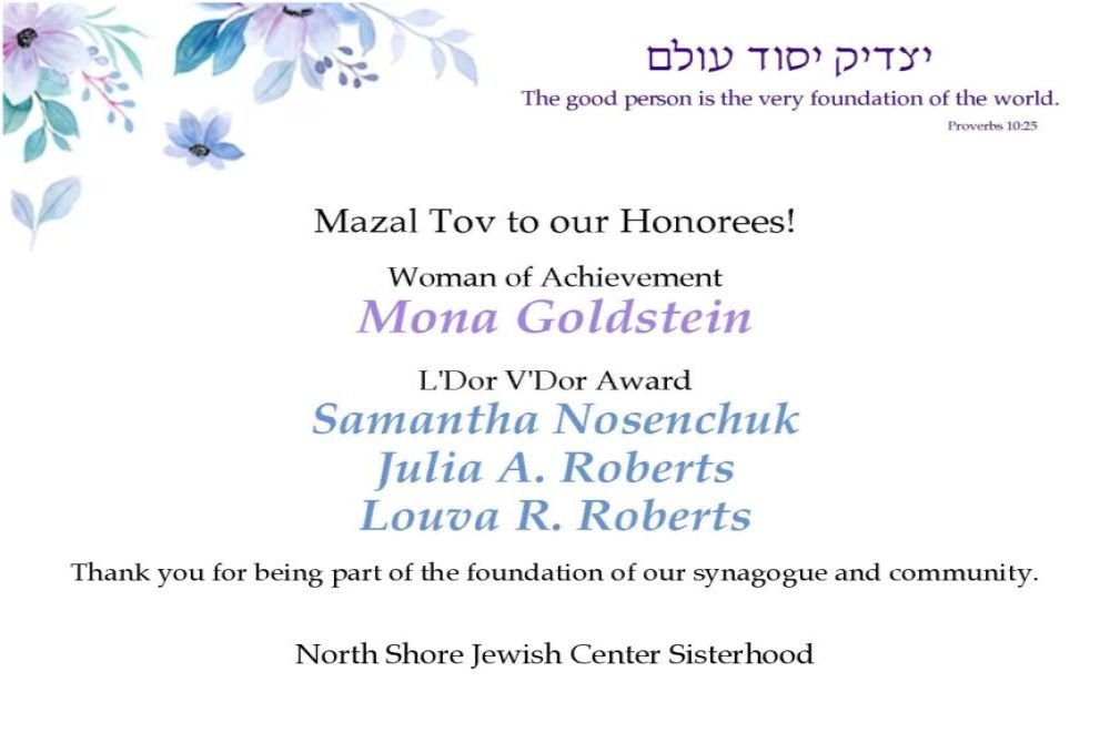 In honor of Mona, a woman full of grace and deeds of lovingkindness, and Samantha, Julia, and Louva, who make our future brighter, with love from Ann Mazel Tov to Gail Weinstein for being the HERJC Woman of Achievement! A very well-deserved honor and we thank you for all that you do for our community! Hewlett-East Rockaway Jewish Centre