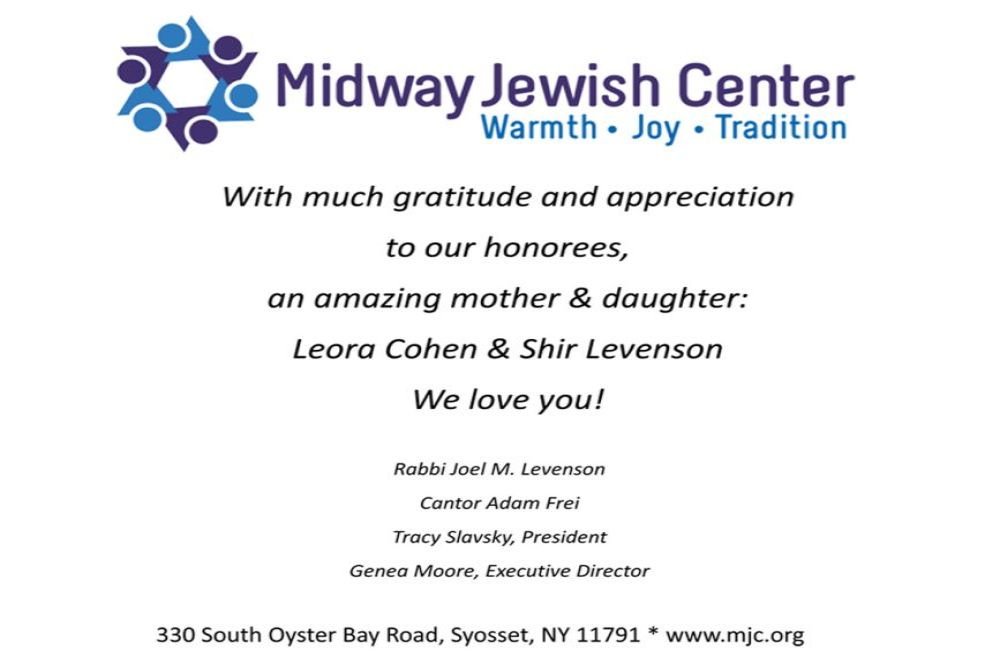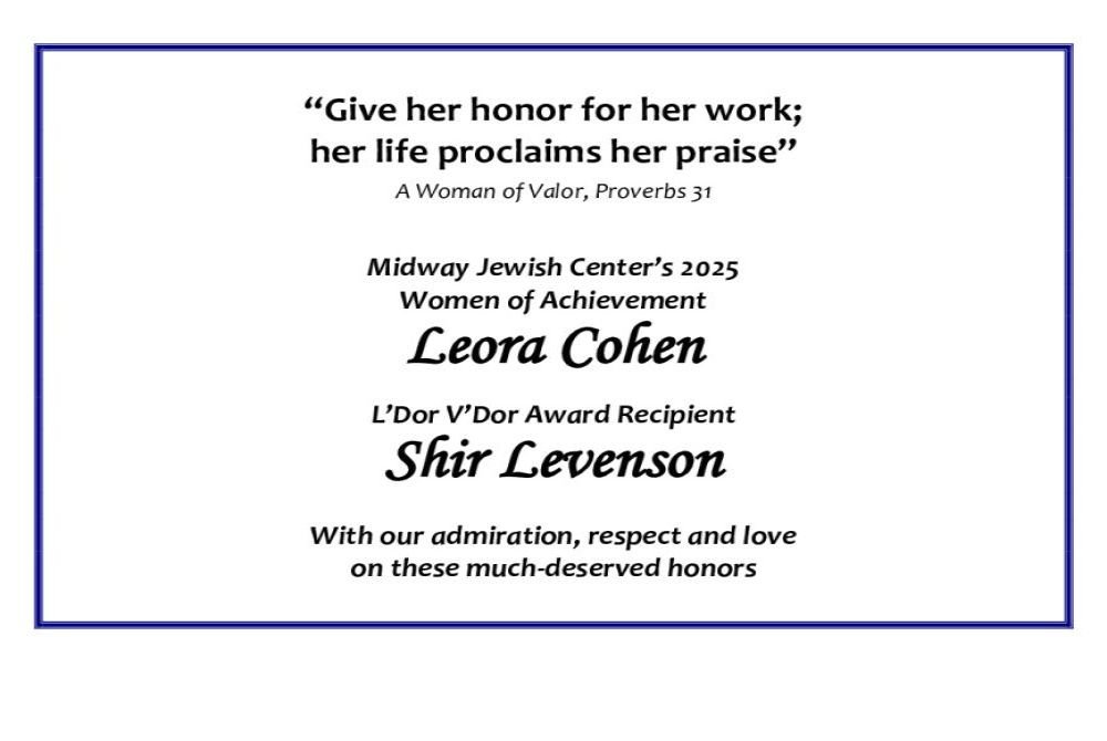 Yasher Koach to Midway's Woman of Achievement Leora Cohen and L'Dor V'Dor Award Recipient Shir Levenson The Men's Club of Midway Jewish Center salutes your hard work, dedication & continuing efforts on behalf of our Congregation and Conservative Judaism Mazel Tov to MJC's Honorees Leora Cohen our Woman of Achievement, inspires us all with her strength, grace, and unwavering vision. Shir Levenson our L'Dor V'Dor Award recipient, represents the bright future of our tradition. The Executive Committee at MJC Bronze