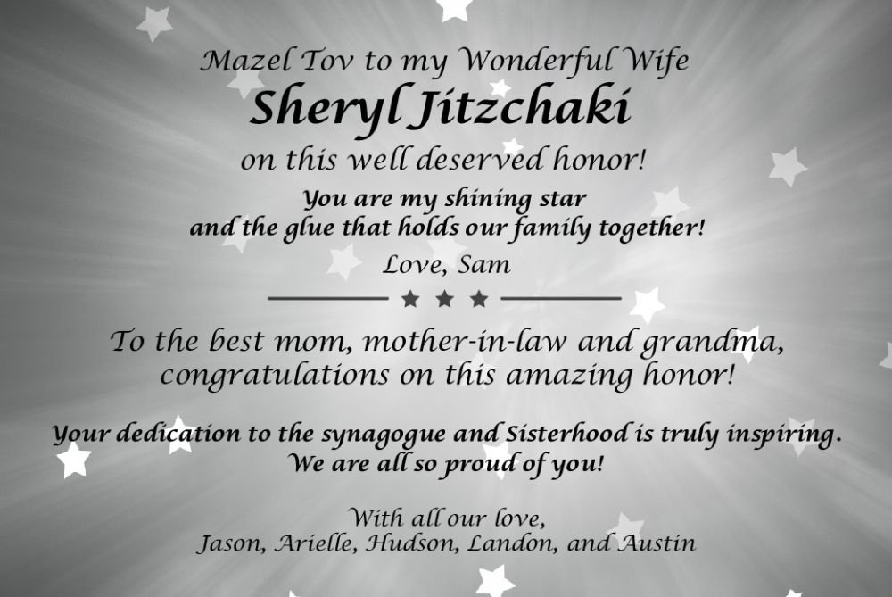 Gail Weinstein you deserve to be honored with the other Honorees!!! Congrats! Love Nancy and Michael Rehns Always Mazel Tov to our wonderful daughters. Love, Mama, Papa, Babuka, The Aunts, The Uncles and Cousins. We are so proud! Congratulations to Sheryl Jitzchaki for all you do for everyone! Judi and Rod Ross Mazal Tov to my wife and best friend! This honor well defines your kindness and compassion. Will Ryder Friend
