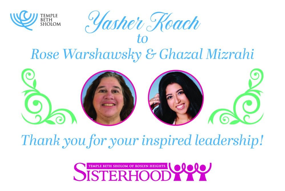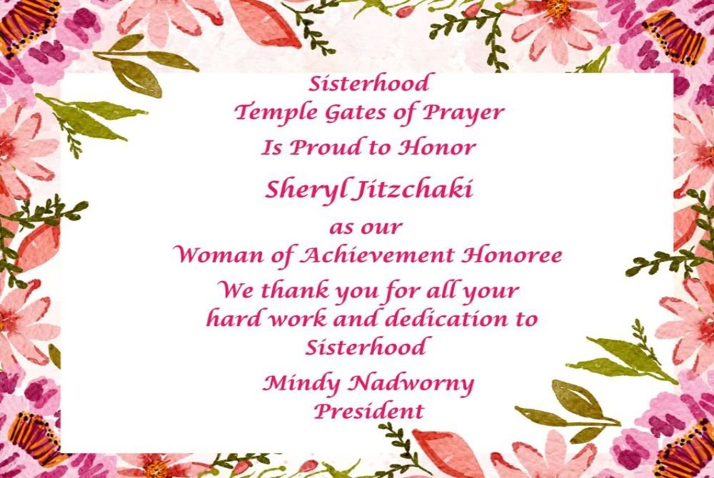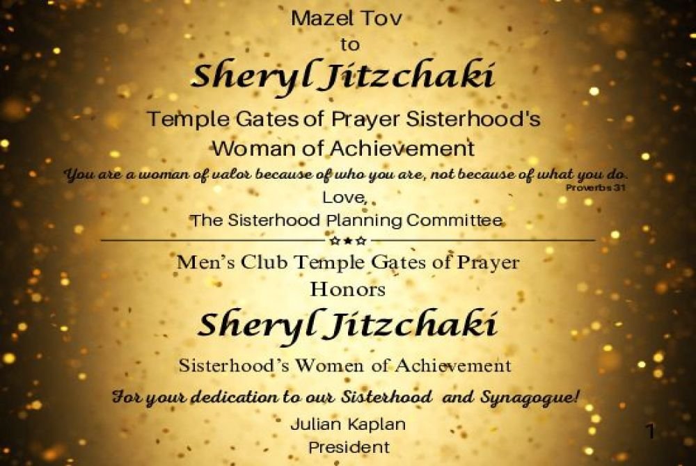 Mazal Tov to ROSE WARSHAWSKY and GHAZAL MIZRAHI of Temple Beth Sholom -- With Admiration, Miriam Silverman Mazal Tov to Ele Ryder, We appreciate your kindness, dedication & generosity to our community. Love, SH of TBE Heléne- Congratulations on a well deserved honor.Your determination & dedication to helping others is a wonderful attribute. Shelley & Larry Slutsky Mazal Tov Sheryl Jitzchaki Thanks for all your hard work for our Sisterhood at Temple Gates of Prayer! Susan Smith Friend