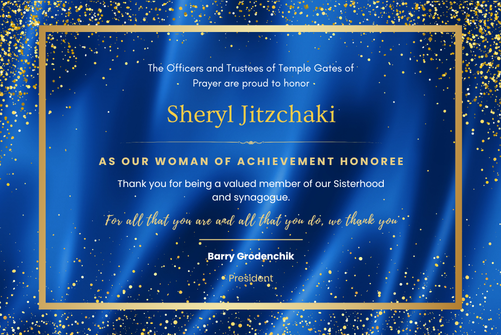 Mazel Tov Sheryl Jitzchaki on this well deserved honor for all you've done for Temple Gates of Prayer's Sisterhood. Mazal-Tov Bonnie on this well deserved honor! Your friends, Debbie & Pauline Mazel Tov to Annie Lelonek for your lay leadership & selection as a L'Dor V'Dor honoree. We are so proud of you! Congregation Beth Tikvah Board of Trustees Mazel Tov to Beth Stern, from CBT's Bd of Trustees as a 2025 Woman of Achievement honoree - a Woman of Valor. Friend
