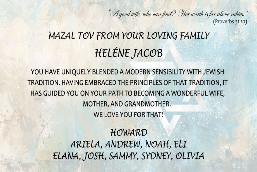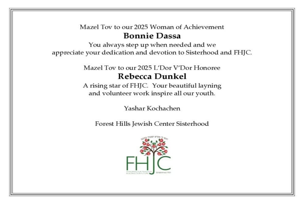 Annie, you never cease to amaze! Continued success in everything. Love Mom, Dad, & siblings Jessica, Rachel & Ezra What a pleasure it is to have Helene Jacob as an inspiring leader in our Hillcrest Jewish Center. Mazel Tov! Rochelle and Herb Mandell Mazel Tov to Manetto Hill Jewish Center Sisterhood honoree Deborah Hershkowitz and all the other honorees. Yasher Koach! Mazel tov to Leora and Shir and all of the honorees. We appreciate all that you do for Am Yisrael. Erika & Charles Friend