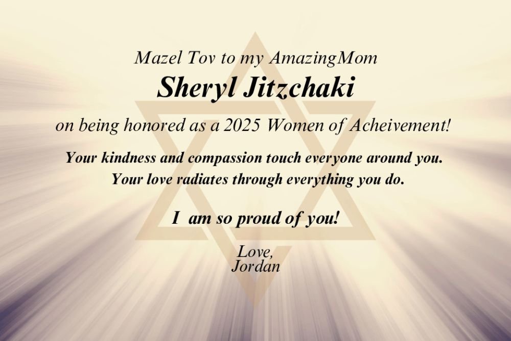 Thank you Barbara Kaplan for your guidance and help this year. It is always good to work with you. Teri Fields Leora, truly a Woman of Achievement! Thank you for all you do. With much appreciation, Teri Fields Kol Hakavod to Bonnie Dassa on this well-deserved Woman of Achievement honor Shirley and David Zucker Congratulations Sheryl Jitzchaki - we are so proud of your accomplishments. Much Love, The Goeringers Friend