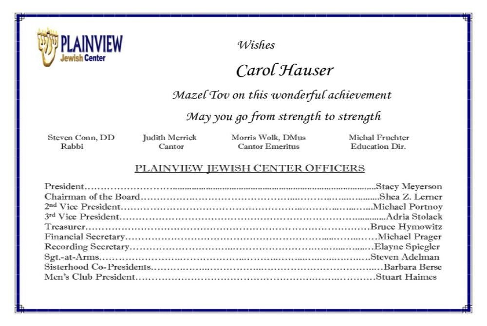 Plainview Jewish Center Sisterhood congratulates Carol Hauser Our Woman of Achievement Award Recipient You are a shining example of dedication to our Sisterhood Mazel Tov to Jill Lander, Our Woman of Achievement! Your dedication and generosity are inspiring to all! Sisterhood of Congregation B'nai Sholom-Beth David. Bronze