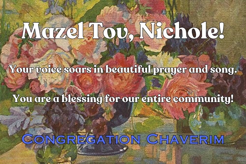 Mazal Tov to Nichole Chorny for leading our t'fillot with beauty, understanding and spirit. We look forward to many more years of meaningful prayer and song. Richard and Joan Green