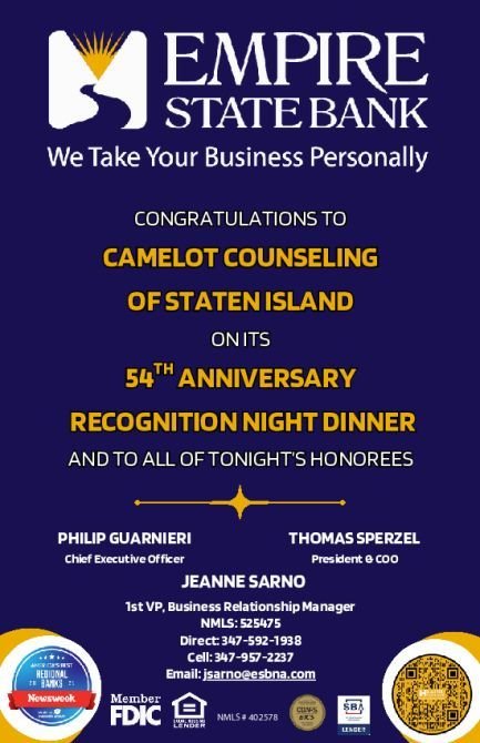 Congratulations to Camelot on 54 years of support to the Staten Island community. Thank you for continuing to be a guiding light for recovery.