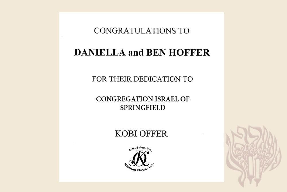 to our friends Ben & Daniella Hoffer on receiving this much-deserved honor. We have heard Ben & Daniella talk about Congregation Israel of Springfield for many years and all the projects they were working on. We are so proud of all they have accomplished and look forward to sharing in many smachot together! With much appreciation and gratitude, Michel & Maeira, Simon, Ezra & Genevieve Werthenschlag Mazal Tov to my dear brother