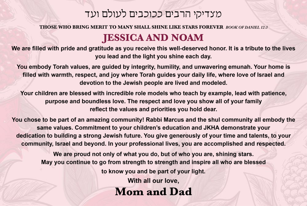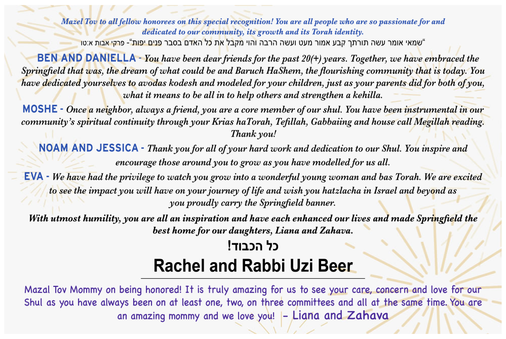 community with vision, warmth, and unwavering commitment. With Hashem's help, may they continue to lead and inspire us all for many years to come.