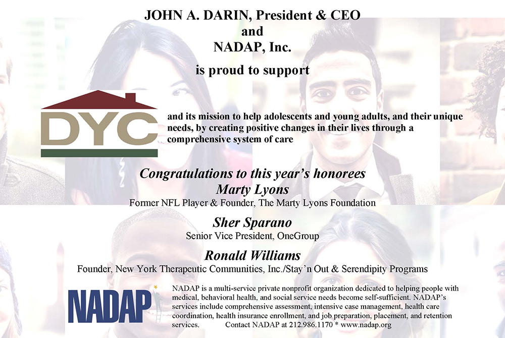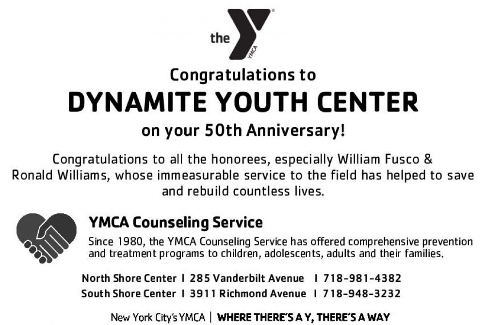 Congratulation DYC for 50 years of amazing service & Congratulations to Dom S. upon his completion. You Did It! The Burke Family Congratulations to Joseph D., Michelle K., and Dan P. on your successful completion of the Dynamite program! Love, Carol D'Auria Deepest gratitude to DYC staff. So many families would be lost without you! Thank you for your life saving work. Dagny Duhamel Quarter Page