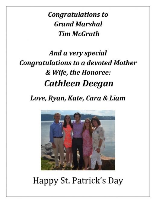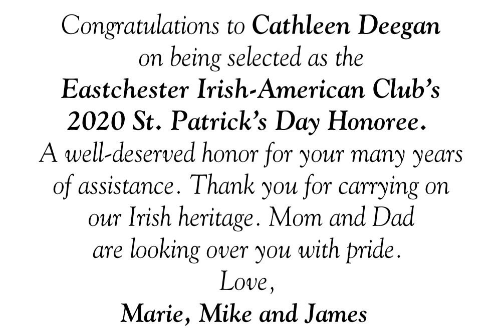 Parade Sashes to Grand Marshal McGrath and Parade Honoree Cathleen (Cathie) Deegan, from Eastchester, is Saturday, Mar. 7, 2020 at Lake Isle Country Club in Eastchester.