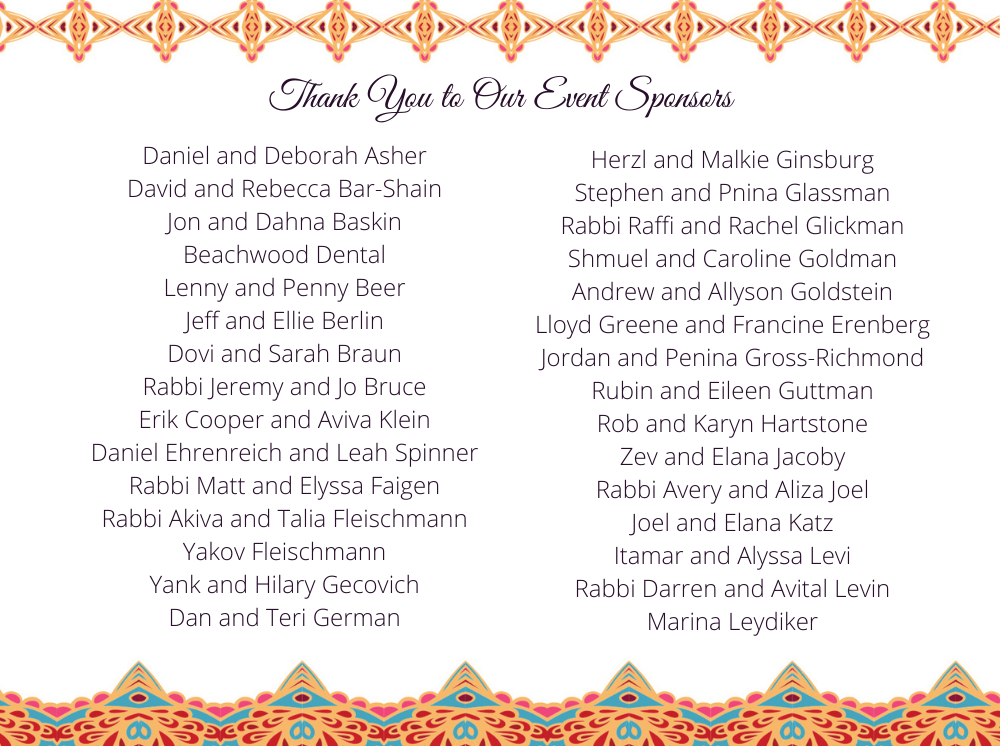 Administration for the love and support of our children. Chana and Benny Schloss & Family