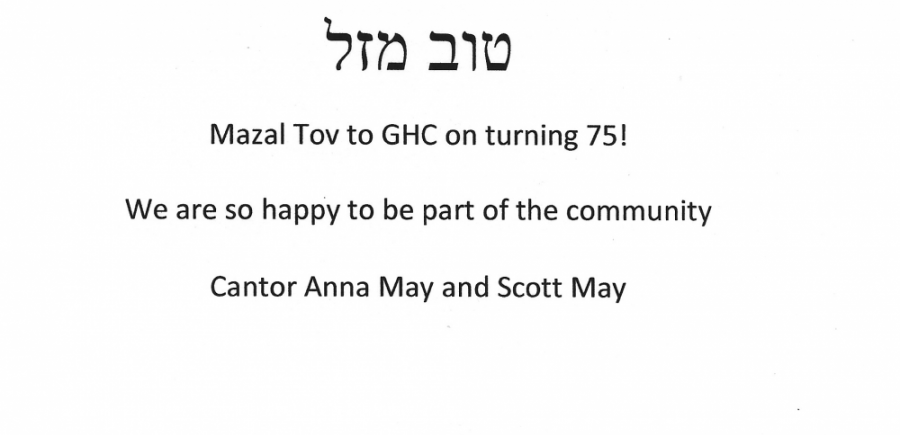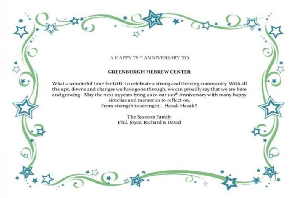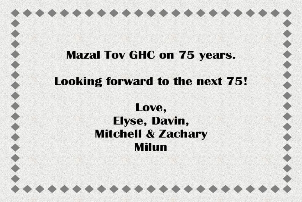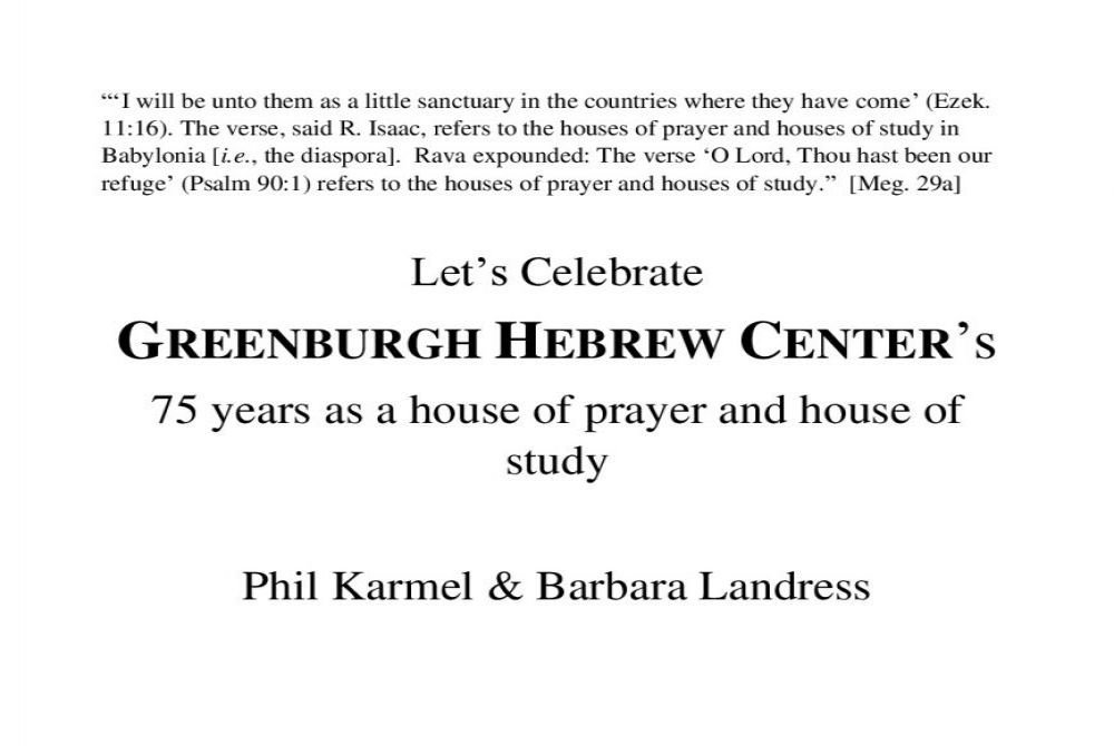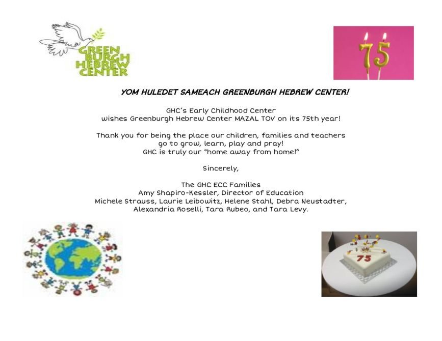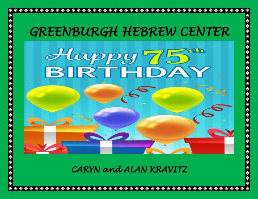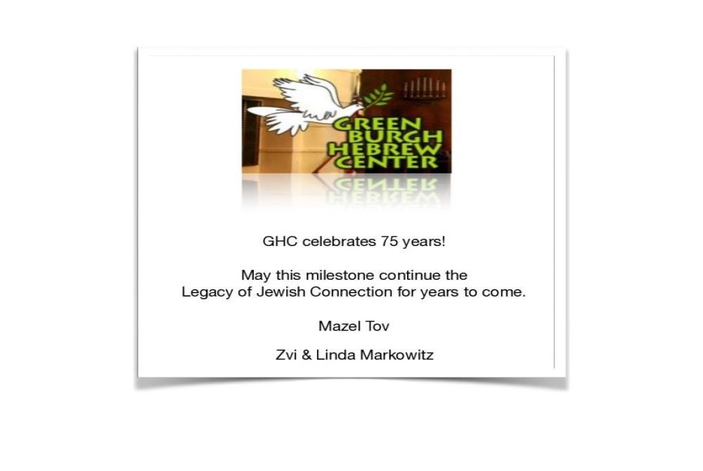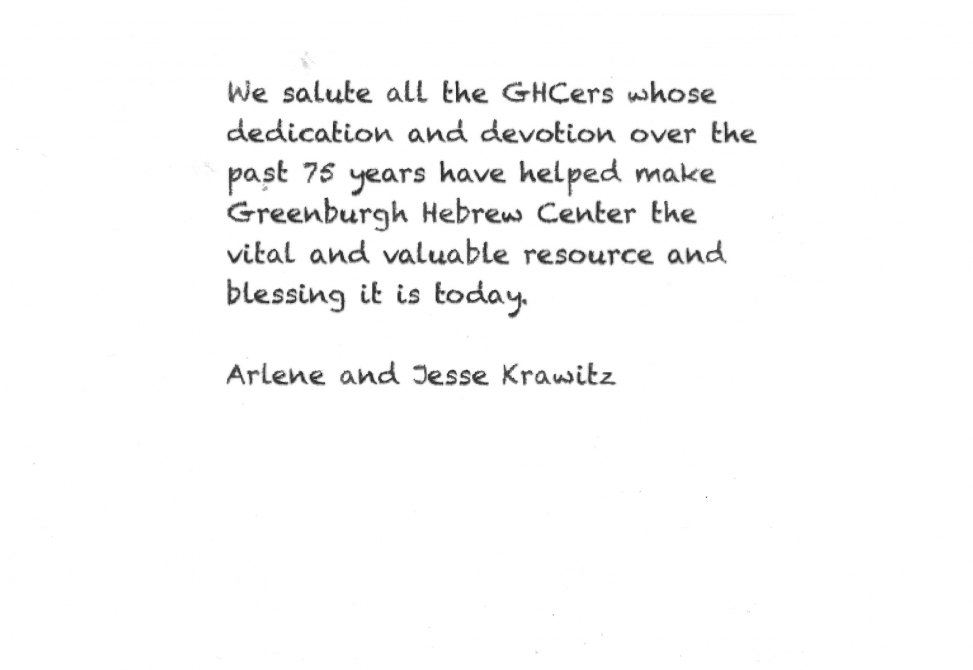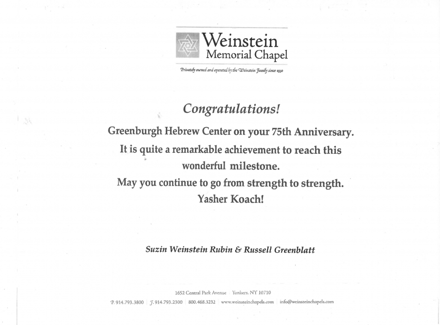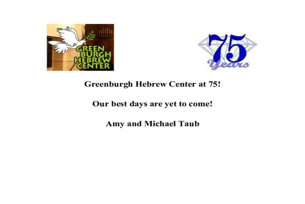 CONGRATULATIONS TO GREENBURGH HEBREW CENTER 75 YEARS YOUNG AND STILL GOING STRONG MAY WE THRIVE AS A COMMUNITY FOR MANY YEARS TO COME Nora and Jonathan Contract