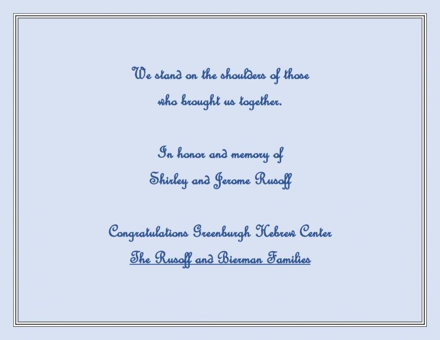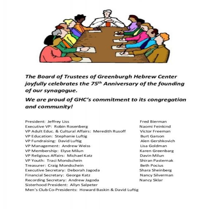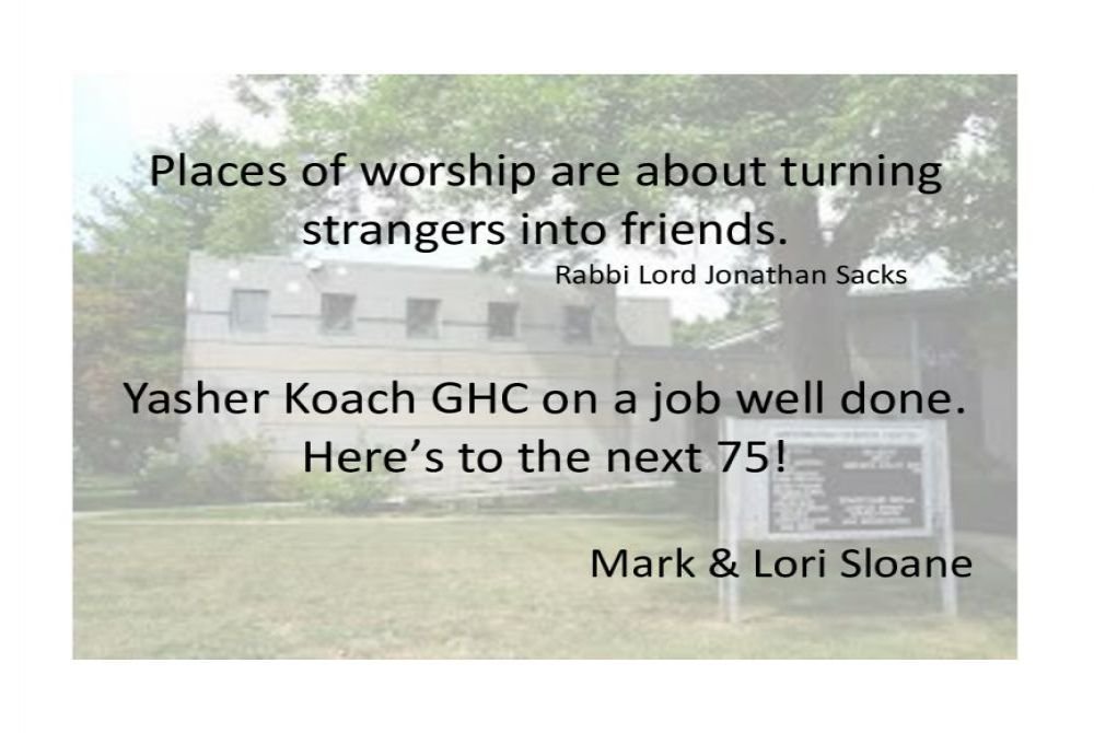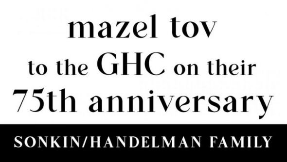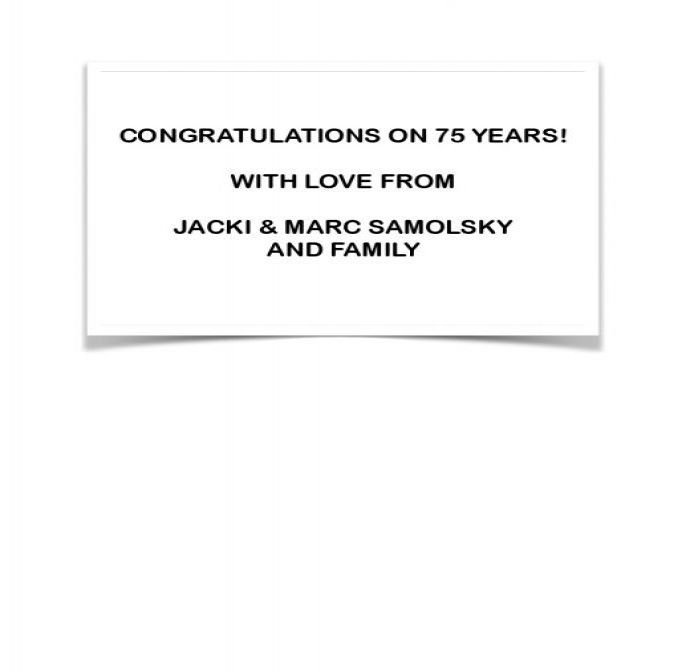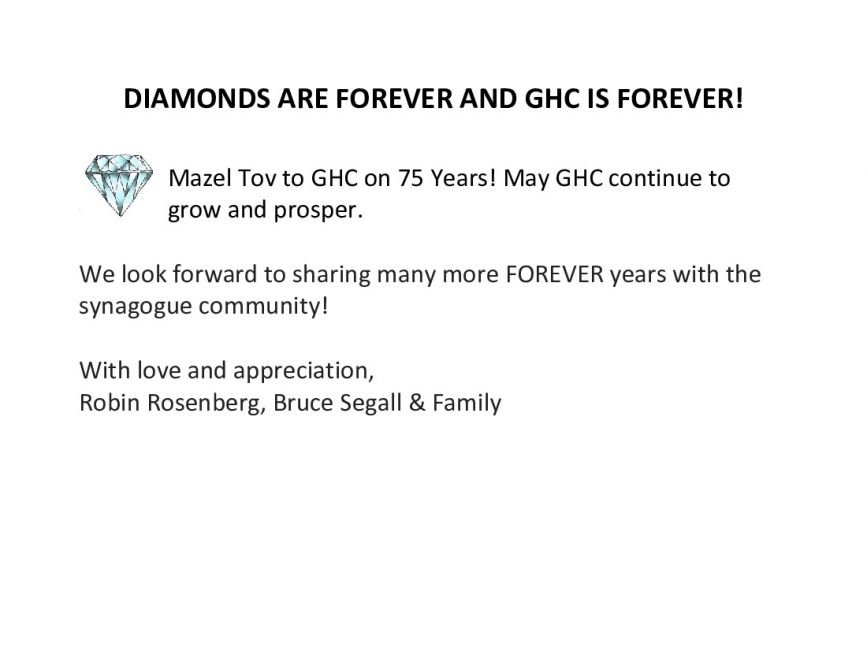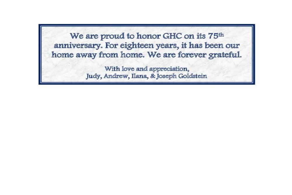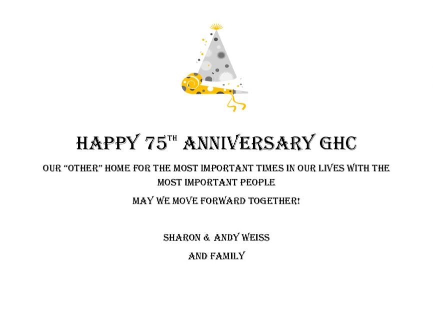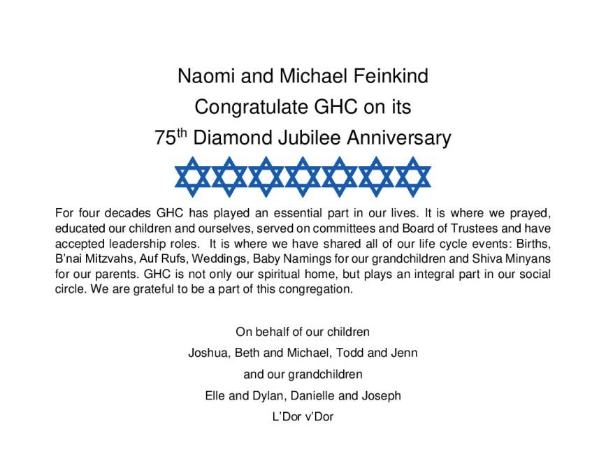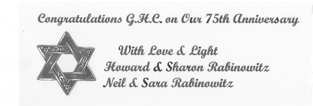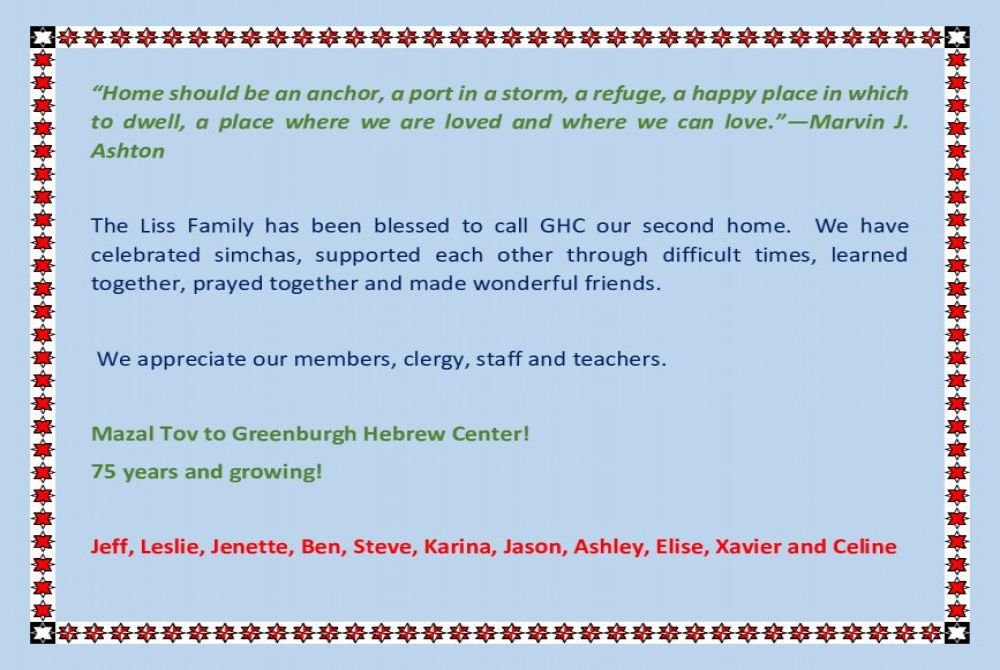 CONGRATULATIONS TO GREENBURGH HEBREW CENTER 75 YEARS YOUNG AND STILL GOING STRONG MAY WE THRIVE AS A COMMUNITY FOR MANY YEARS TO COME Nora and Jonathan Contract