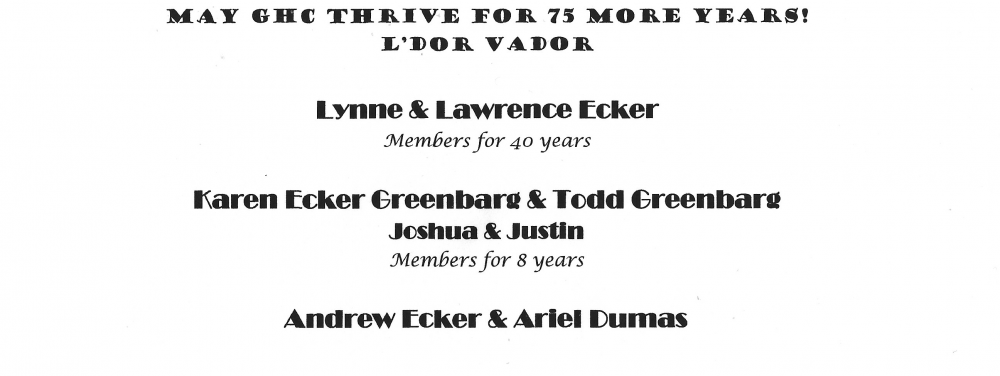 We are proud to be part of the past and to remember our family milestones at GHC: 1969 - naming of Judy Michelle Milefsky, 1971 - naming of Rochelle Ann Milefsky 1982 - Bat Mitzvah of Judy Michelle, 1984 - Bat Mitzvah of Rochelle Ann Hebrew school graduations, Graduations from Community Hebrew H. S. in White Plains Throughout the years, the Milefsky Family (Vivian, Norman, Judy, Rochelle) have contributed greatly to the life and growth of GHC through committee chairing: Board of Trustees and Executive Board, USY, Fundraising and as Sisterhood President (twice) as well as our financial support. Let us continue to celebrate the future of GHC for years to come. Hazak, Hazak, Hazak. Vivian and Norman Milefsky Judy, Brian and Tyler Sepinski