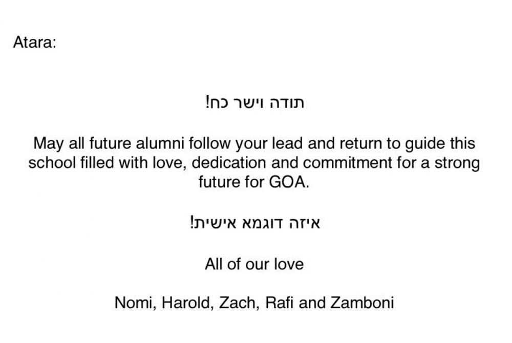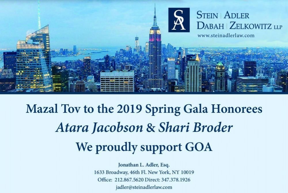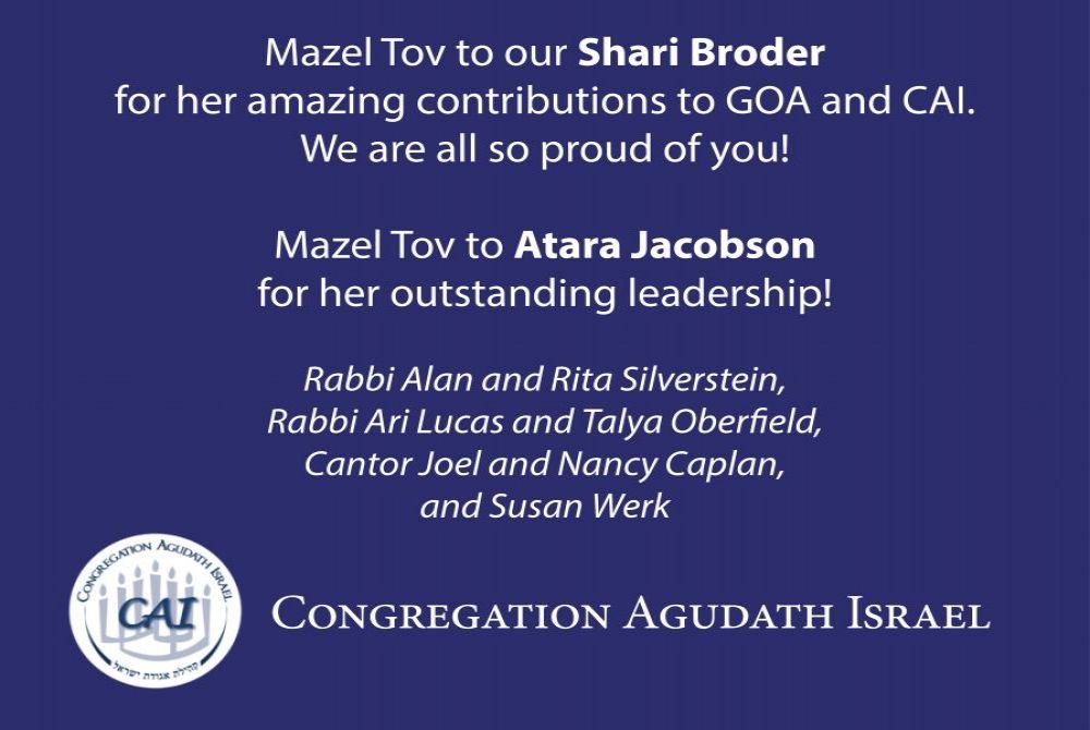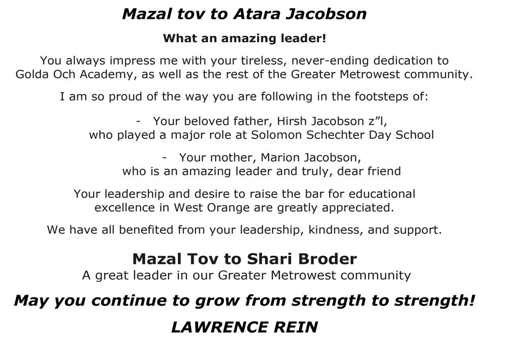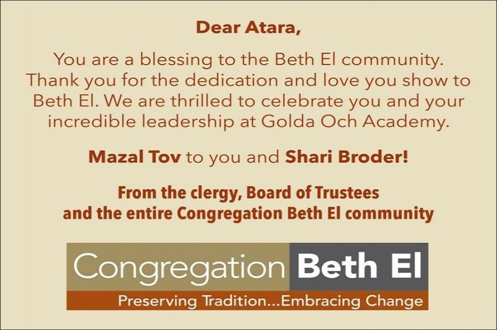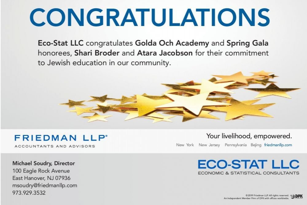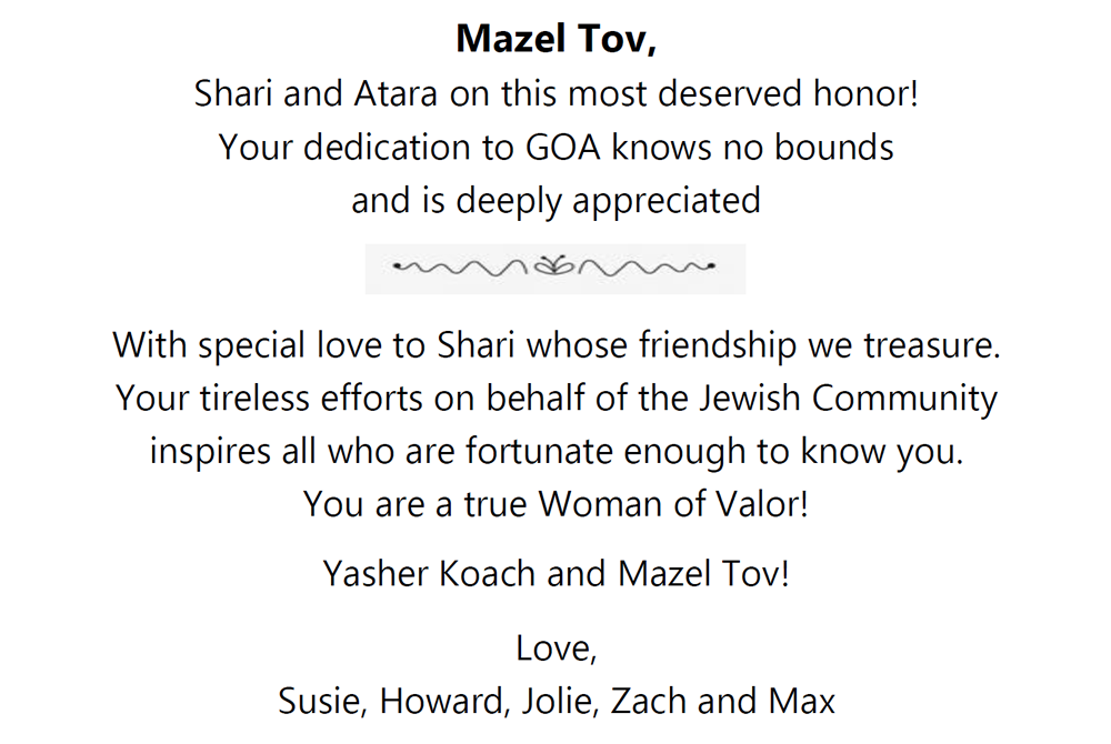 Shari and Atara, for their tireless efforts in support of Jewish Day school education at Golda Och Academy! Debbie and Steve Nadel