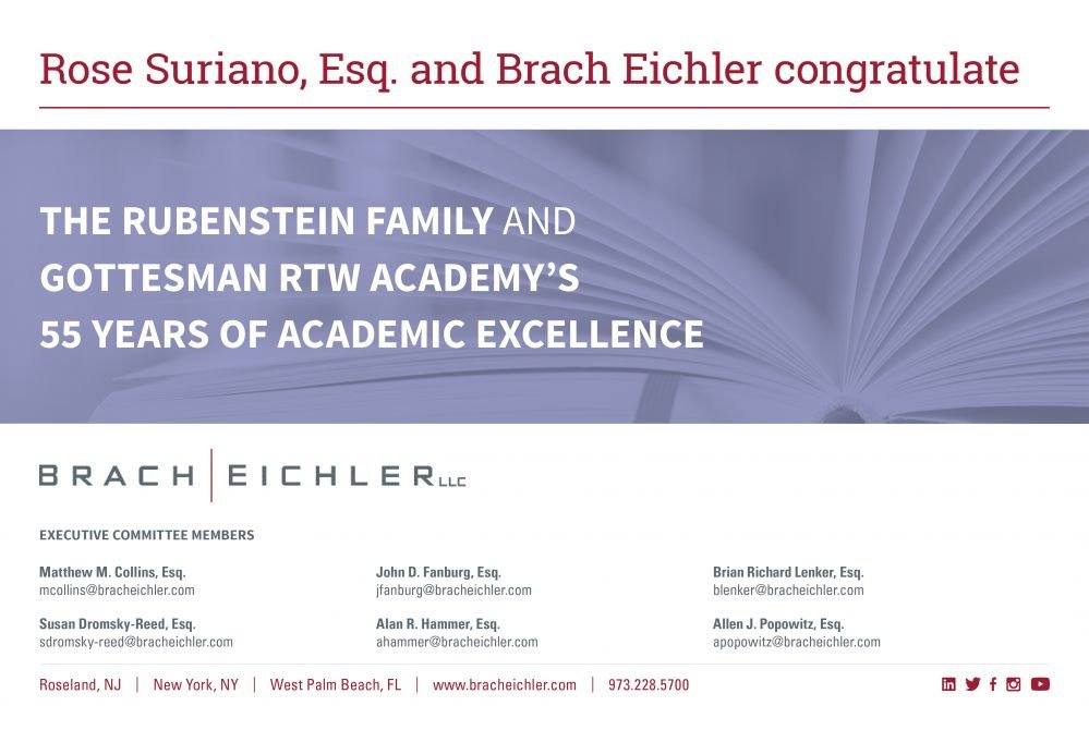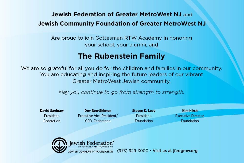 and this special moment is now a part of that history. Thank you and Mazal Tov to Bill and Andrew and the Rubenstein Family on this wonderful honor. Mazal Tov to Phyllis and Nancy on your retirement. You mean so much to our family. Mazal tov to GRTWA on 55 Beautiful Years May this school always go from strength to strength Naomi and Jason Bacharach, Sam '11 and Sarah '12 Chai