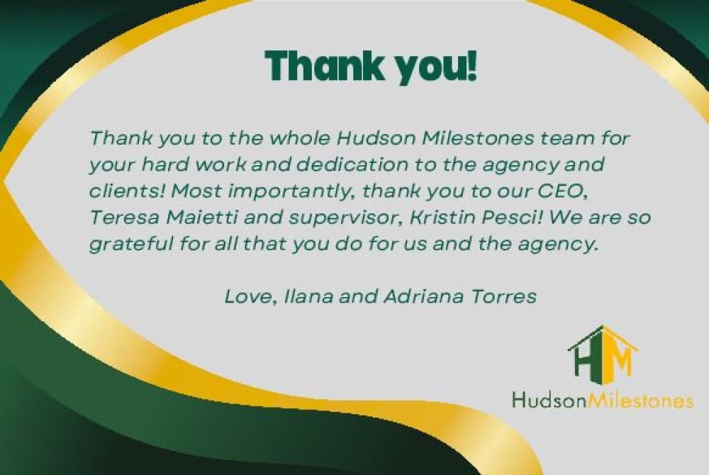 Thank you for your love, support, and wonderful caring service to our Hudson Milestones clients and families!