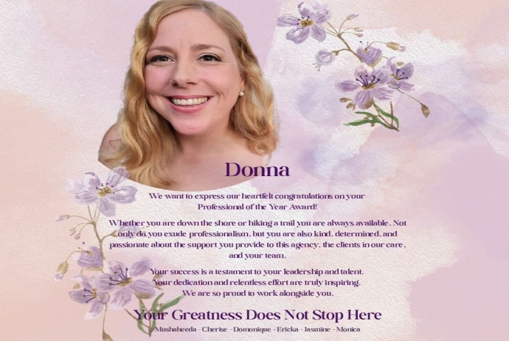 Special Shout Out to Donna D. Thank you for being a positive role model and a pillar of support to those you supervise. Your professionalism, guidance, and unwavering commitment truly exemplify leadership at its best. There is no one more deserving of this award, and we are incredibly proud and honored to call you our Director of Compliance. Congratulations, Donna, you inspire us all!