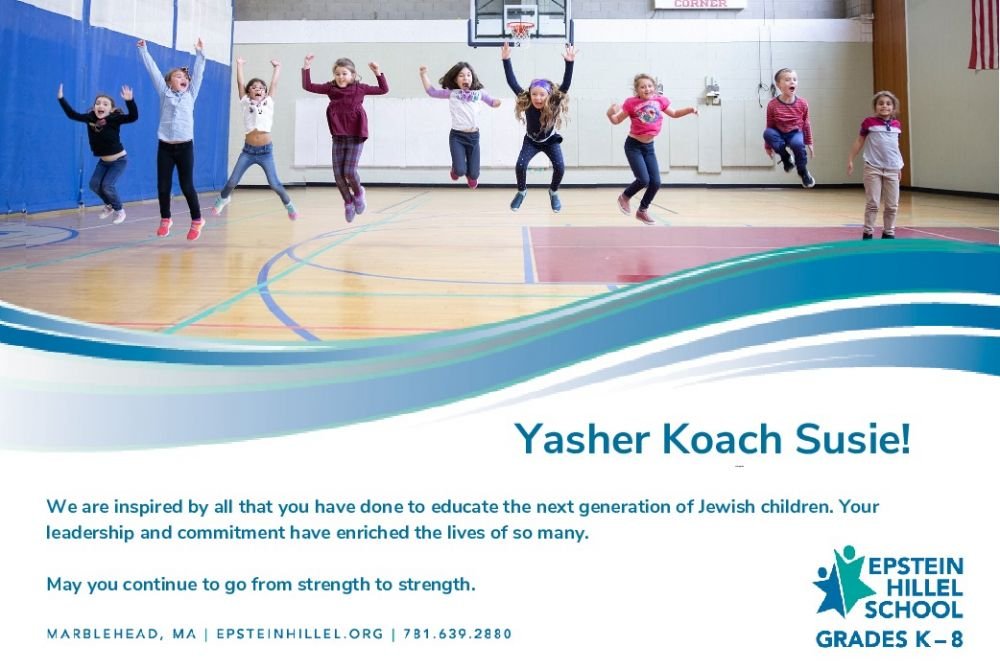 Despite our distance, the music, mindset and ruach of JCDS continues to reverberate in our home every day. Thank you, Susie, for all that you've done to create this lasting (and portable!) impression. With love, The Skolnick Einhorn Family Thank you, Susie, for leading and inspiring us. You exemplify the Habits of Mind and Heart and provide a role model for our children, our families, and our entire staff. Glenda Speyer Half Page