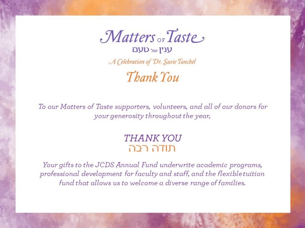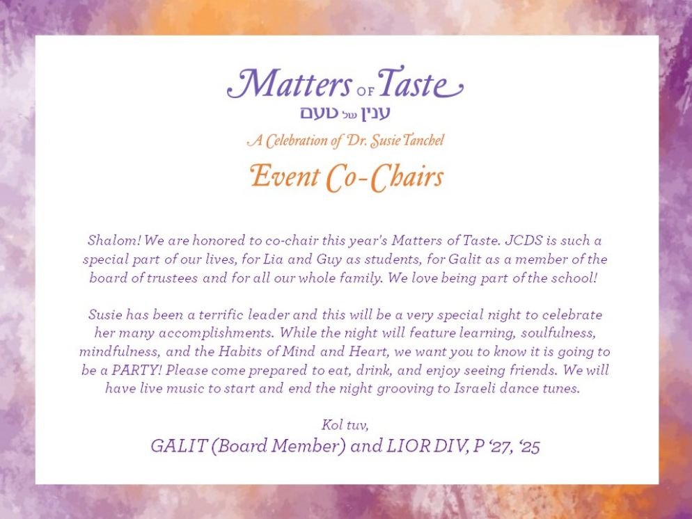 In honor of Galit & Lior Div and our grandchildren Lia (JCDS '25) and Guy (JCDS '27). We proudly support JCDS! Thank you to everyone who makes JCDS such a special place for our family. !תודה רבה Sabba and Savta Ella & Nathan Liberman Sabba and Savta Violet & Hertzel Div Cohen Karen and Joseph Linitz