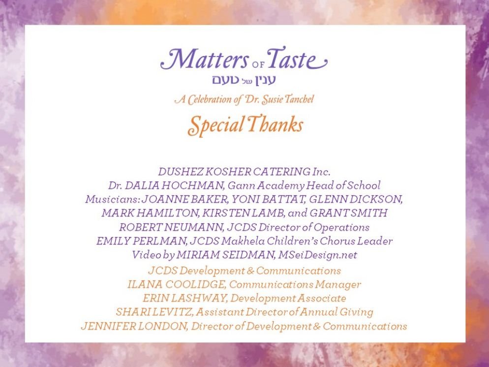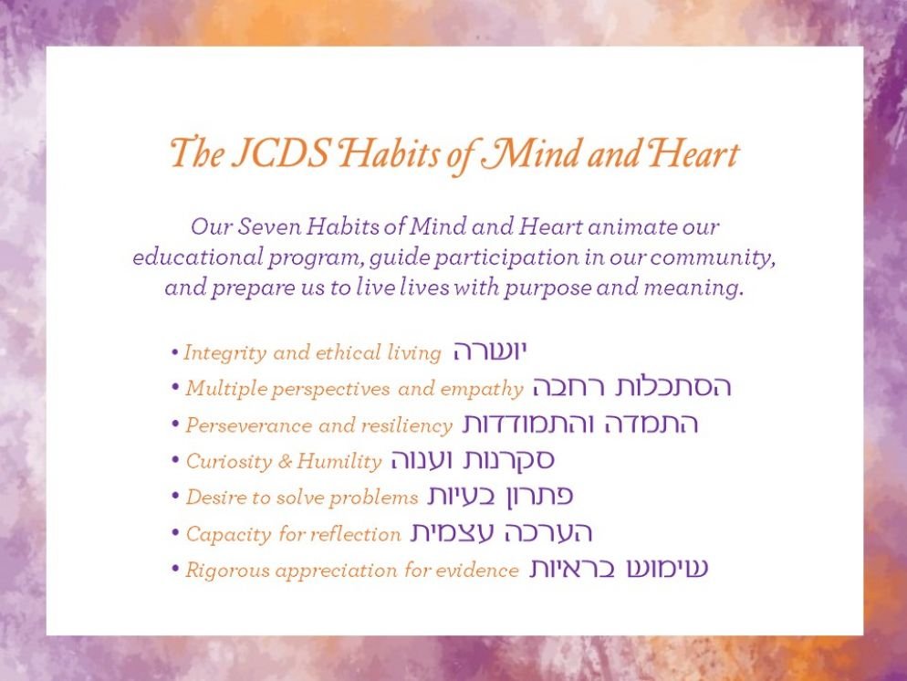 Dear Susie, With deep appreciation for your dedication and leadership these past nine years. Your extraordinary commitment to JCDS is admirable and has made it possible for many children to have the wonderful gift of a pluralistic Jewish education. As an educator, it has been an incredible experience to work at a school where the teaching is guided by the Habits of Mind and Heart. Thank you for leading our wonderful community day school and making a difference for so many children. Wishing you all the best on your next journey! Michelle Janoschek