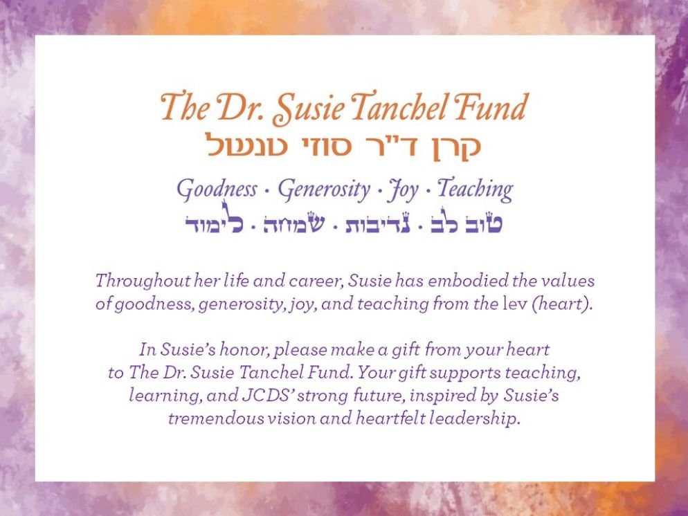 Susie: your warmth, attention, perspective and compassion throughout my family's JCDS application and my conversion process last year will never be forgotten. I look forward to working with you in the fall at Hebrew College, and am confident that my Gan Nitzan student will benefit from your legacy at JCDS in the years to come! With gratitude, Mia Tavan and Family Yonina Hoffman and Jeremy Wanderer