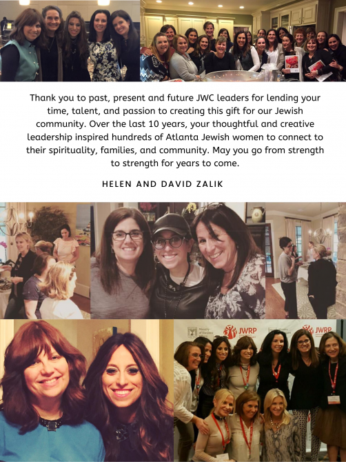 We are so proud of our dear friend, Charlotte, who works tirelessly for JWC & so many other organizations. Love, C5 Mazel tov to JWC of Atlanta and our sister, Gayle Siegel, for an amazing 10 years. We love you! Jeanne, Jeff, Rachel, Beth & Reuben Mazal Tov Carrla, Charlotte, Elaine, Erin, Gail and Robyn Rabbi Binyomin & Dena Friedman and Congregation Ariel Spark