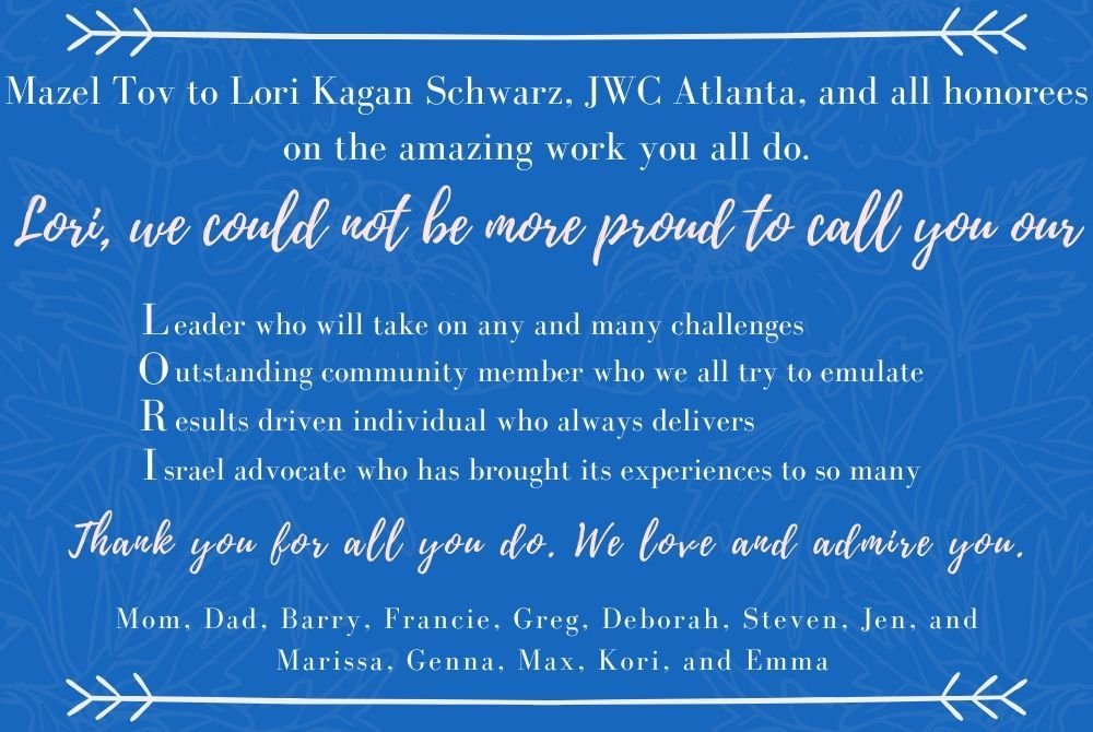 Congratulations to my amazing sister, Lori Kagan Schwarz who co-founded JWC Atlanta. Couldn't be prouder. XO Debbie Kagan