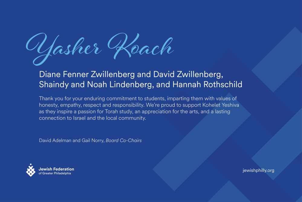 Thank you to the Kohelet Yeshiva administrators, faculty, and staff for your dedication to our school, our students, and our community. Lisa & Jordan Booty