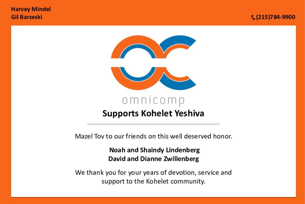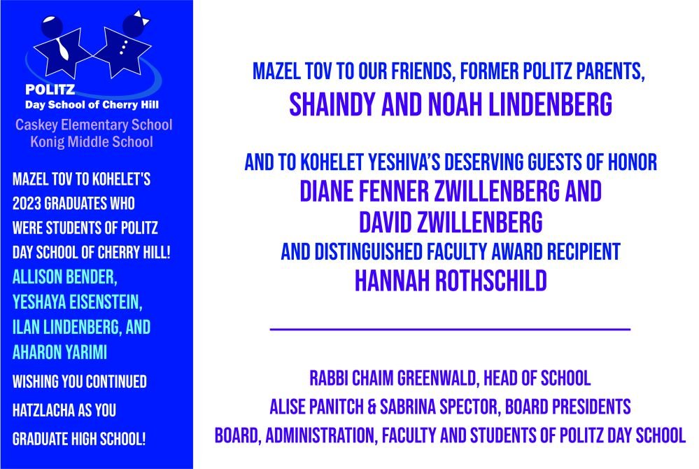 Mazel Tov to the well-deserved honorees! And thank you to the Kohelet Yeshiva administrators, faculty, and staff for your dedication to our school, our students, and our community. Naomi & Ira Sved