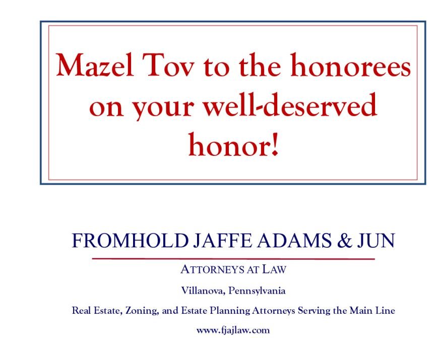 Mazel Tov Noah and Shaindy on your well-deserved honor. We are proud to be your friends (embarrassed of you for being Cowboys and Yankees fans). Daphne & David Price Cheryl & Richie Broth To the Honorees, Congratulations! Law Offices of Debra G. Speyer Estate Planning | Estate Administration | Elder Law Estate Litigation | Guardianship Plaintiff Investment Litigation Two Bala Plaza, Suite 300 - Bala Cynwyd, PA 19004 610-949-9555 - www.SpeyerLaw.com Half Page