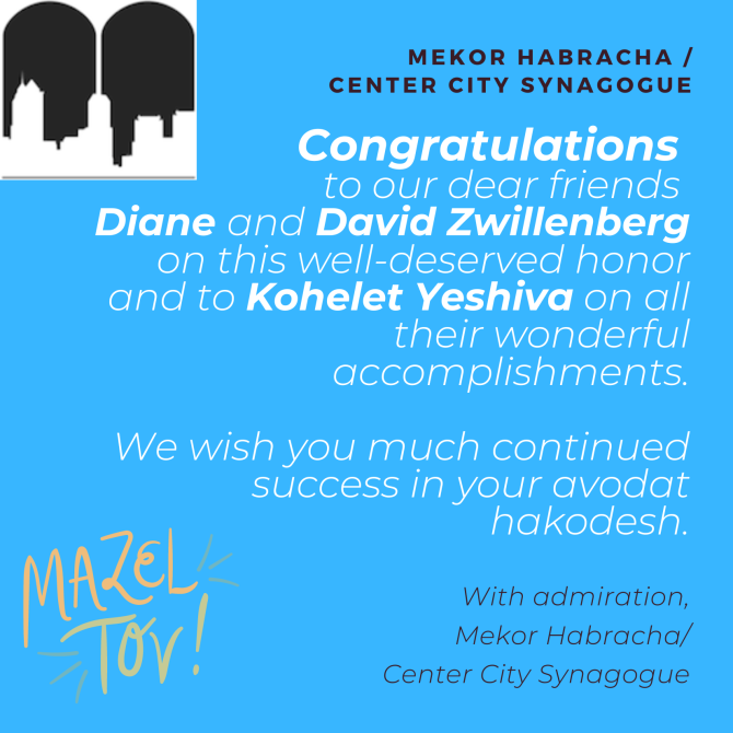 Mazel Tov to Diane and David Zwillenberg for all you have done over the years for Kohelet Yeshiva! Gilya & Len Freedman