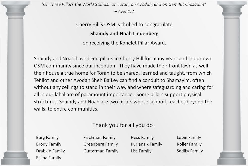 Mazal Tov to our good friends, Noah and Shaindy Lindenberg, on this well-deserved honor! Elyse & Aaron Greenberg