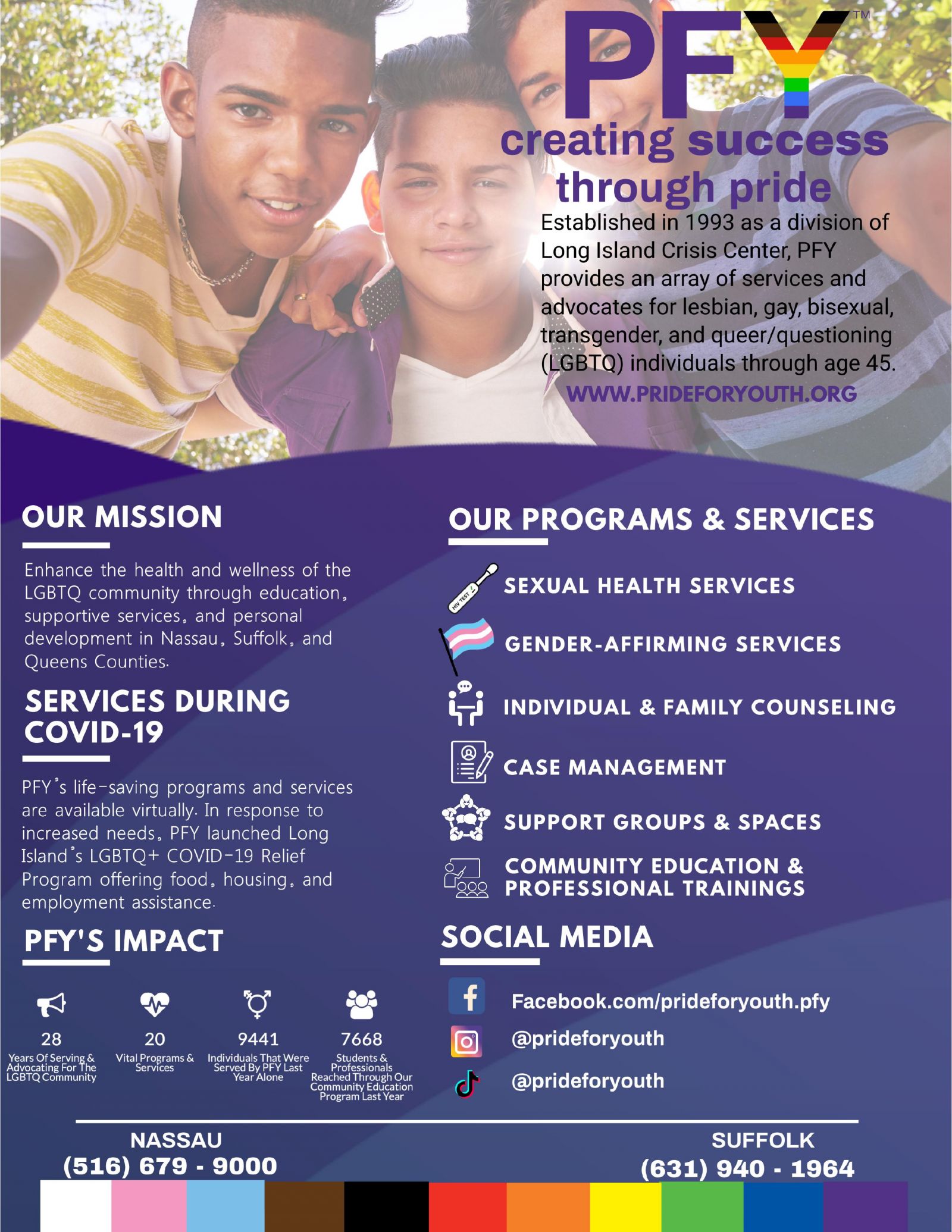 PFY is a service and an advocate for lesbian, gay, bisexual, transgender and questioning/queer (LGBTQ+) youth and young adults across Long Island and Queens. Our mission is to improve the health, wellness and cultural competency of LGBTQ+ young people through education, support and youth development. In 2020, over 9,000 LGBTQ+ individuals and allies benefitted from PFY’s vast array of programs and services.
